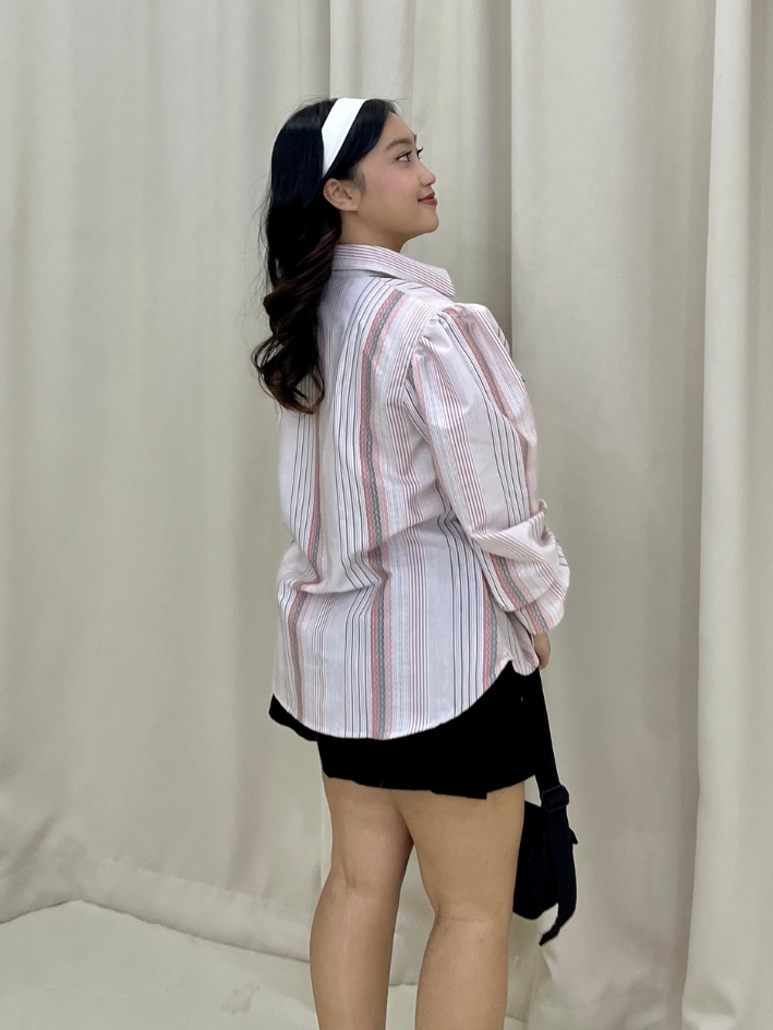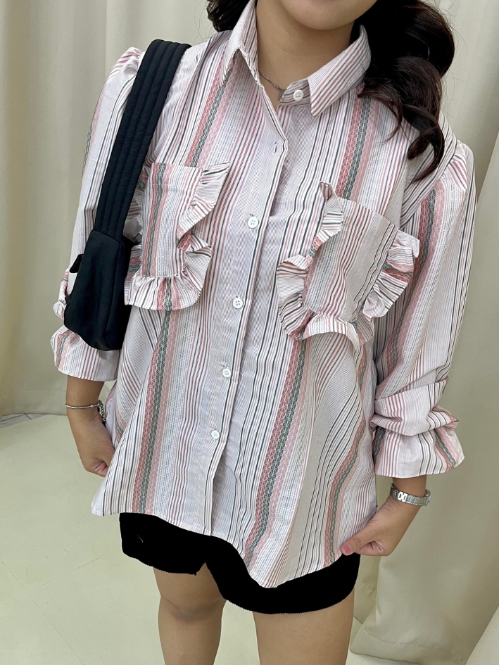 Classic meets playful. This long-sleeve shirt is made from breathable premium cotton and features two oversized pockets with ruffle edges. The flare detail on the sleeves adds a subtle charm, while the soft dusty pink stripe combo gives it a cute and artsy twist.