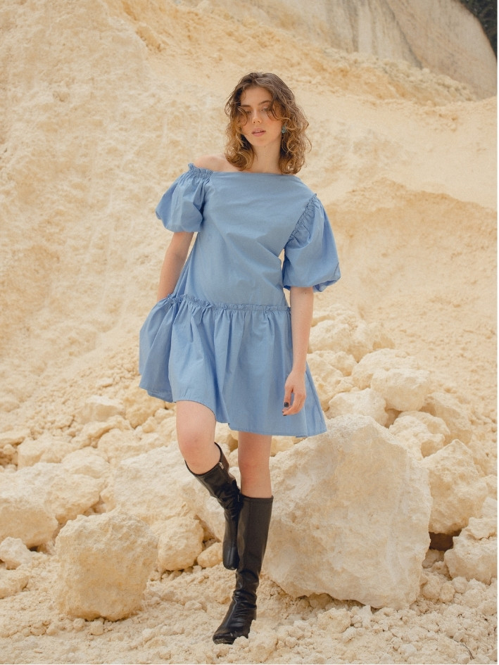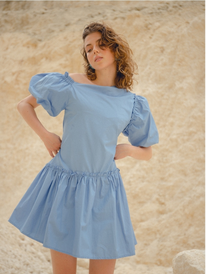 This simple mini blue dress features puff sleeves and a ruffle at the waist.