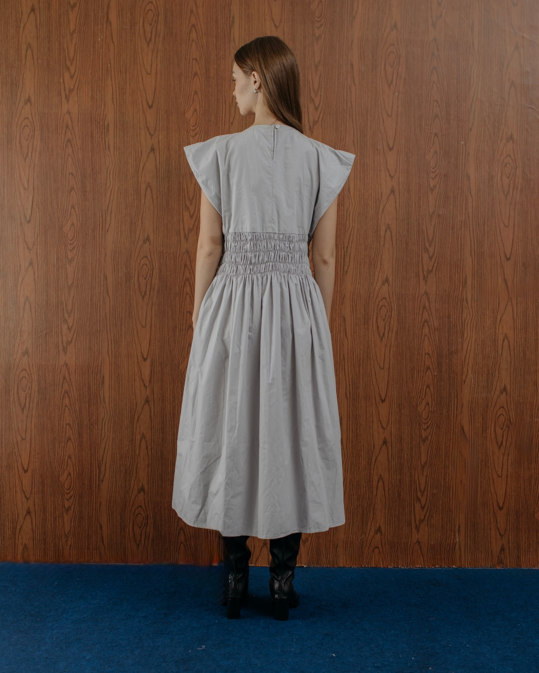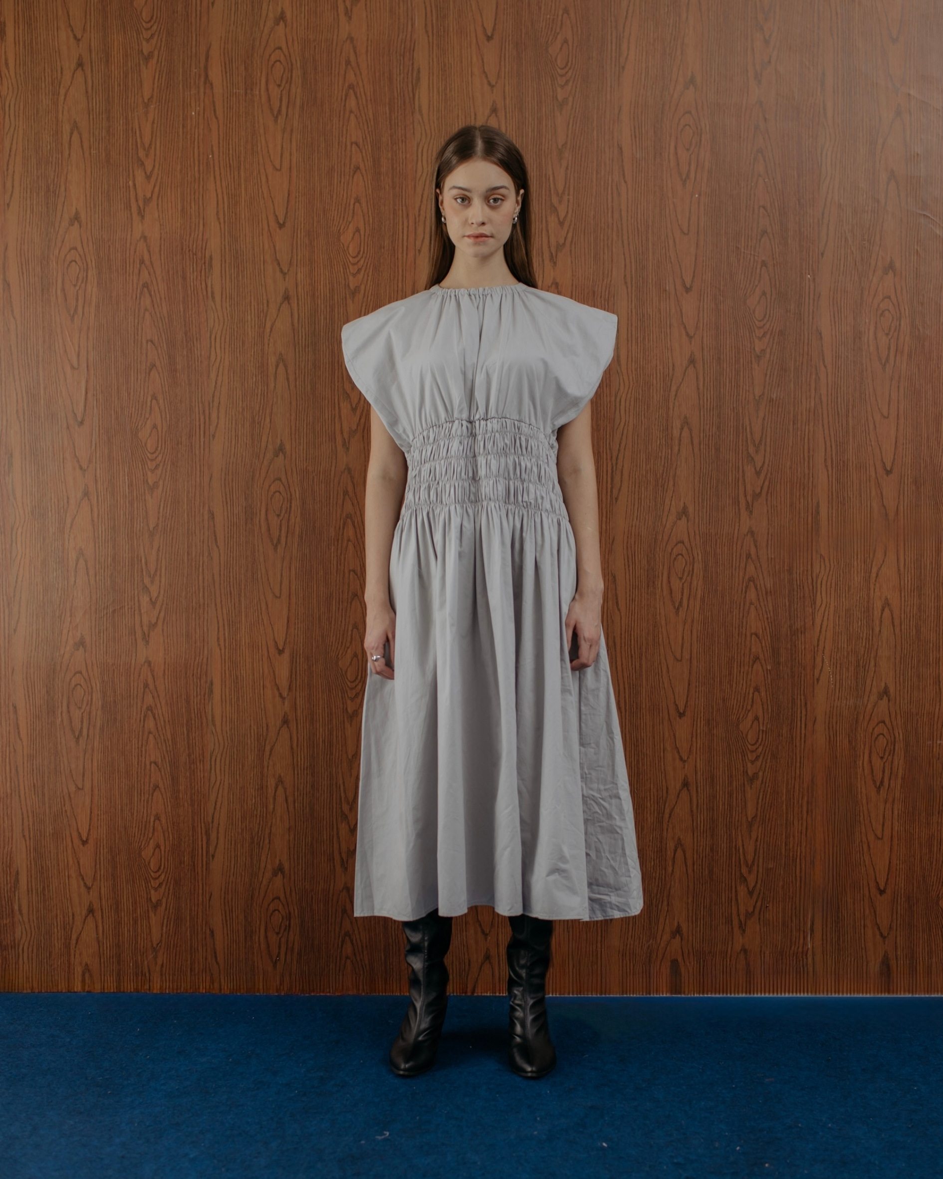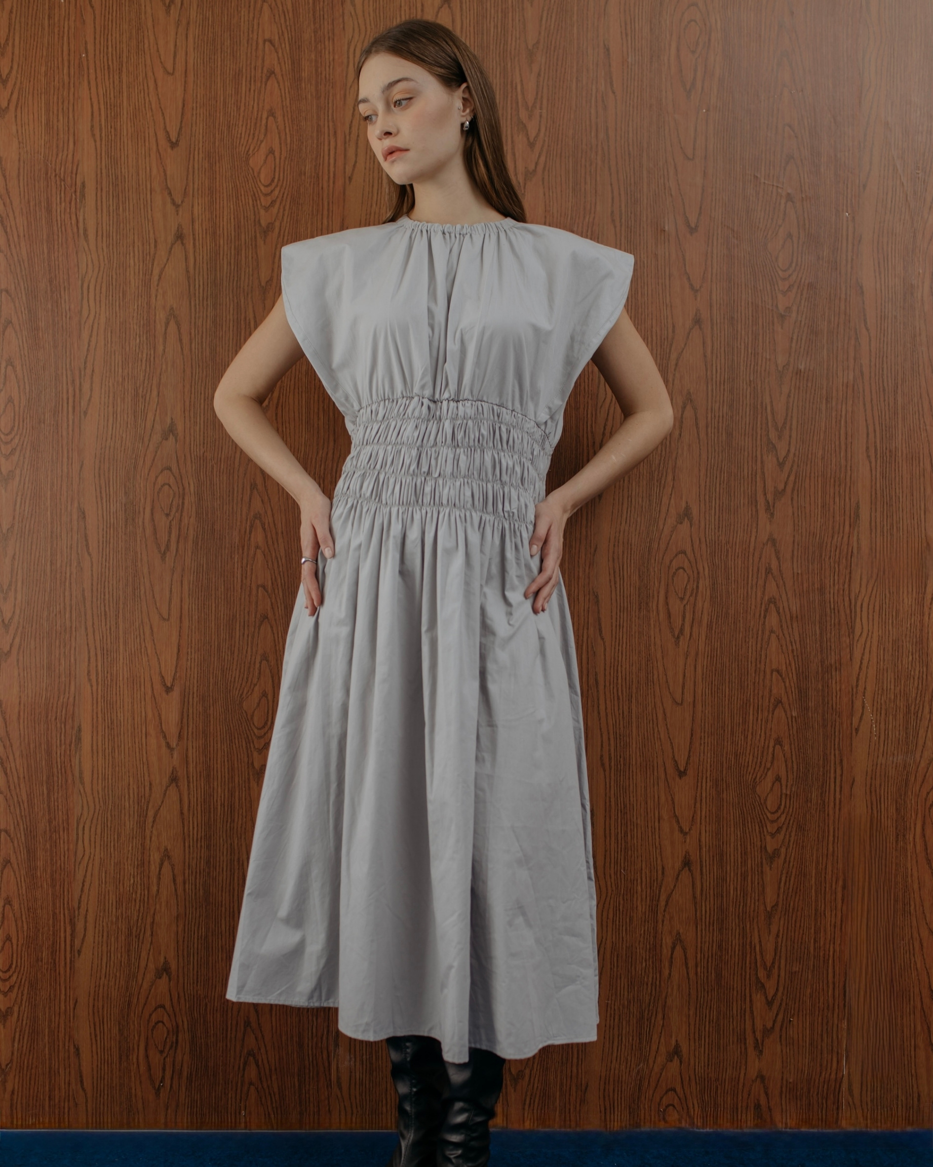 A sleeveless cotton midi with smocked waist detail and flowy shape. Elegant yet simple, ideal for casual occasions or afternoon events.