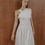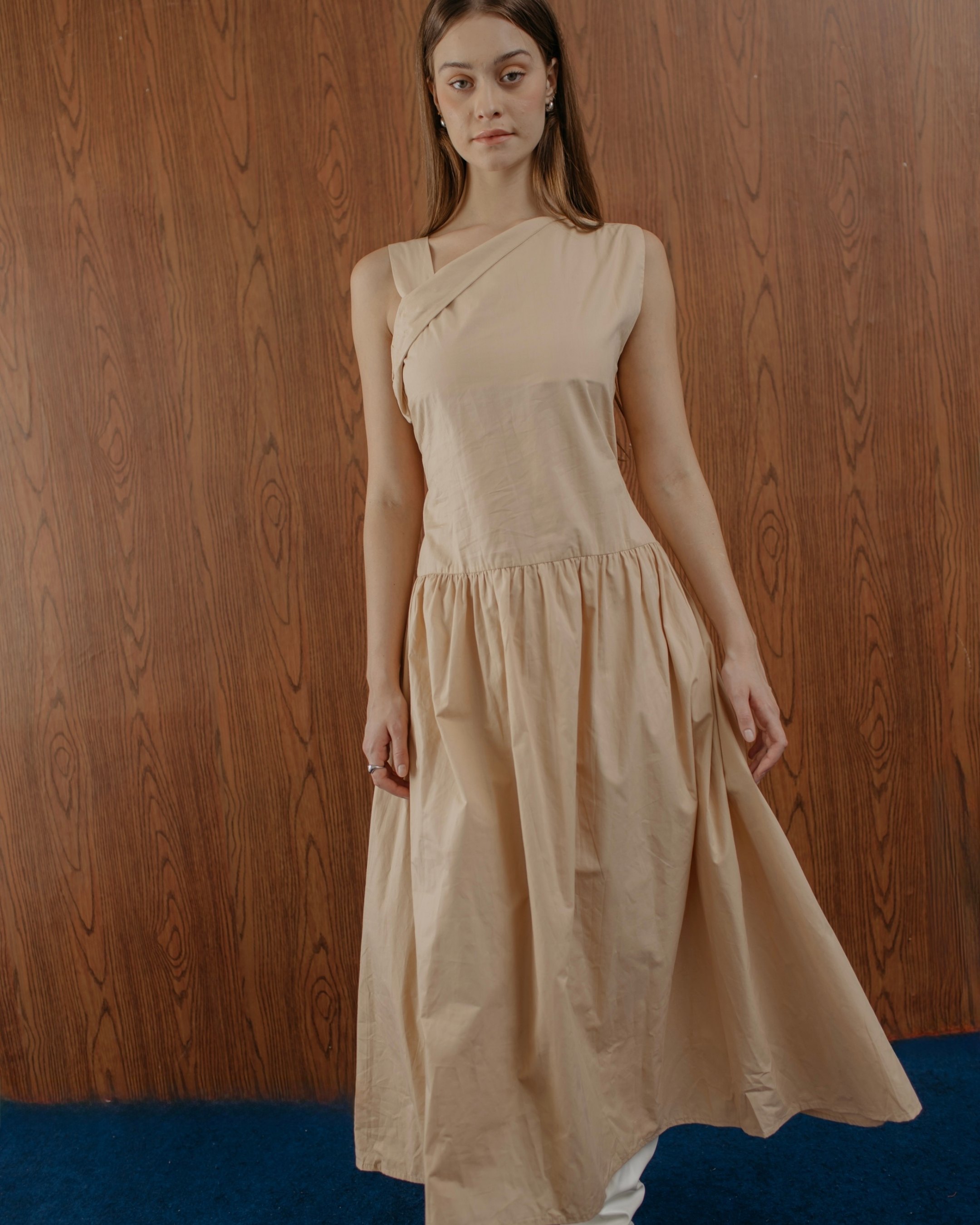 A sleeveless cotton midi with an asymmetric neckline and gathered waist. Simple yet modern — perfect for a refined everyday look.