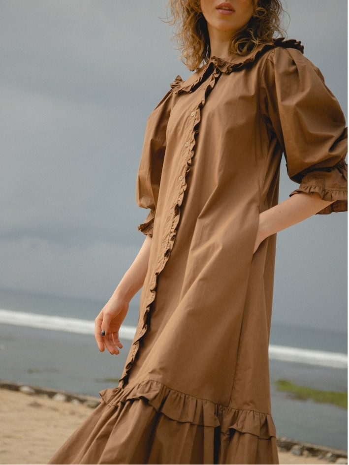 This chic brown dress features a ruffled collar and long sleeves with adjustable cuffs.