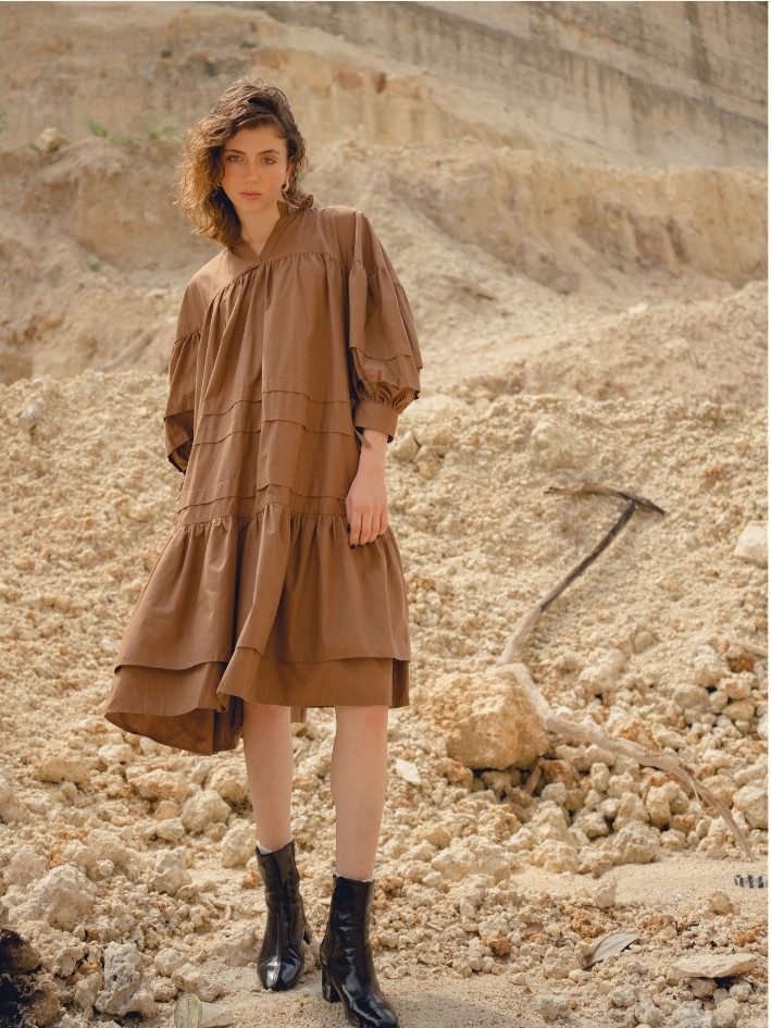 This oversized brown dress features a unique layered cutting and long sleeves with adjustable cuffs.