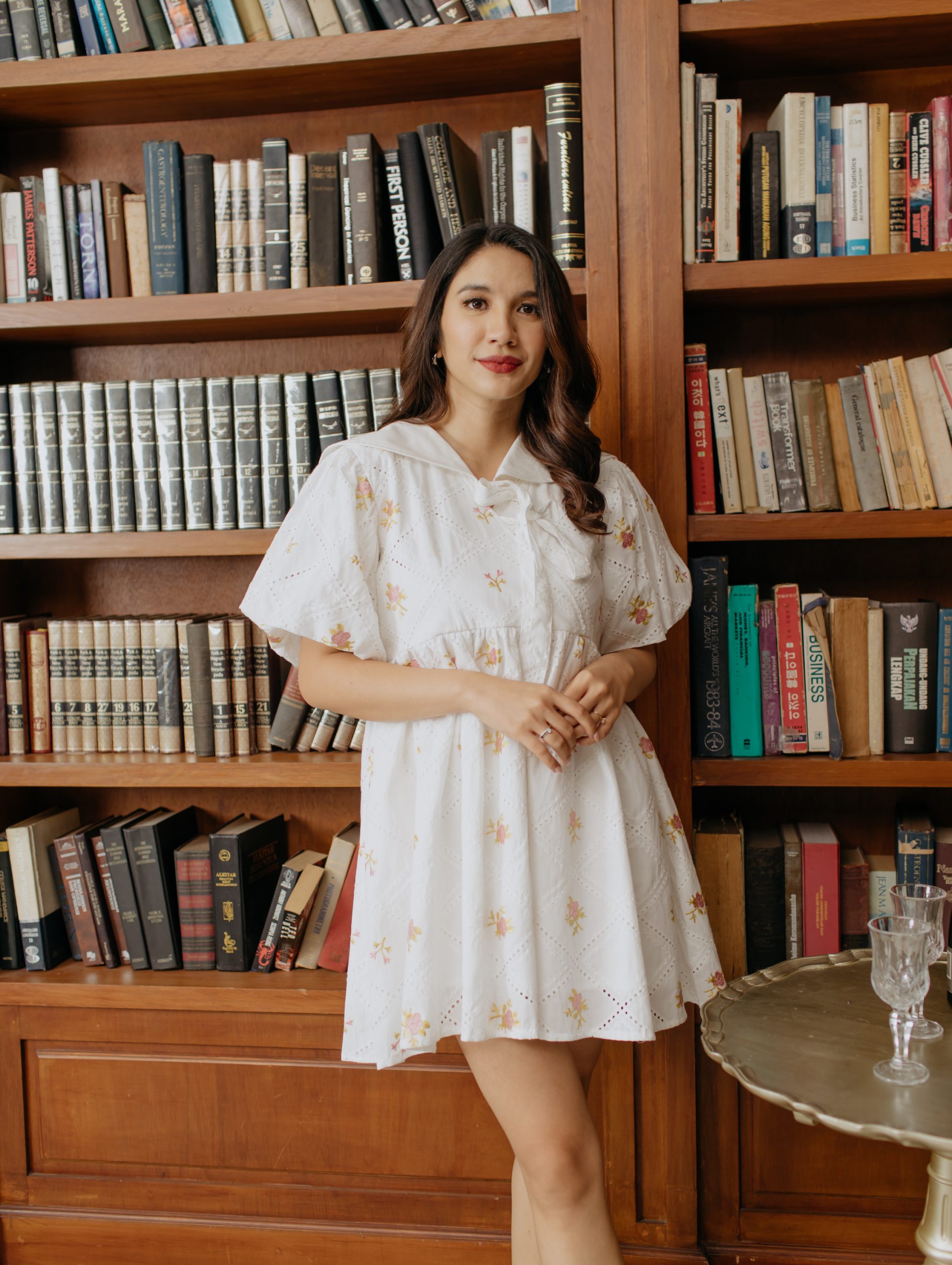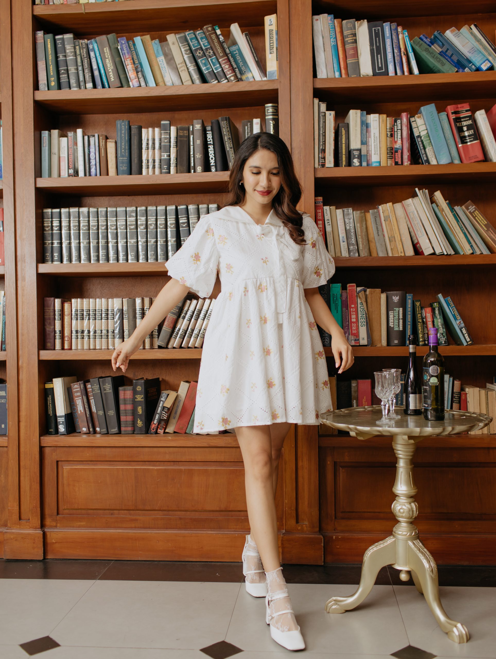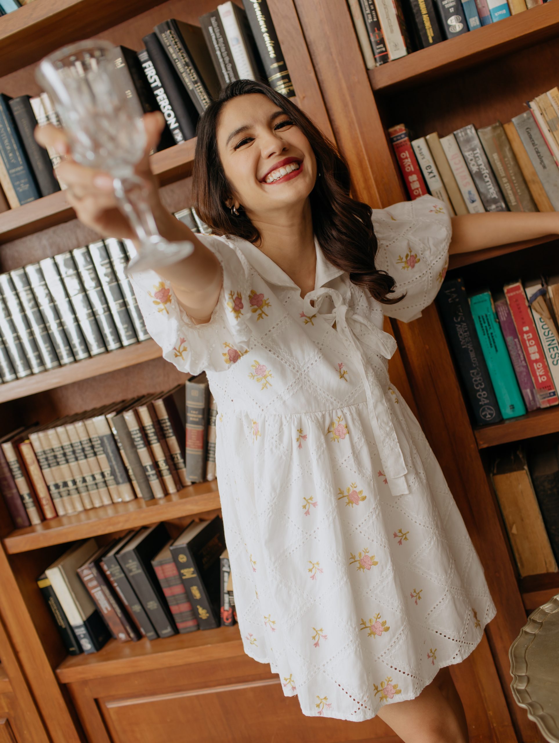 Designed for comfort and style, this mini cotton dress comes with a front tie, soft lining, and pretty pink floral embroidery.