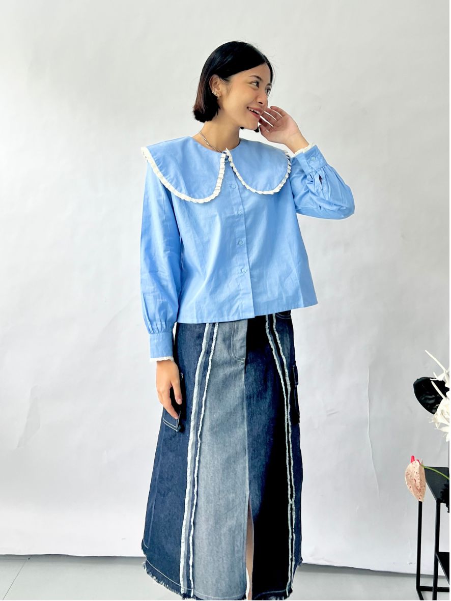 Stay chic and comfy with our blue cotton poplin top. Featuring a bold collar, it’s soft, breathable, and perfect for daily wear.