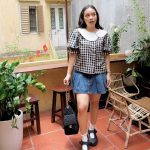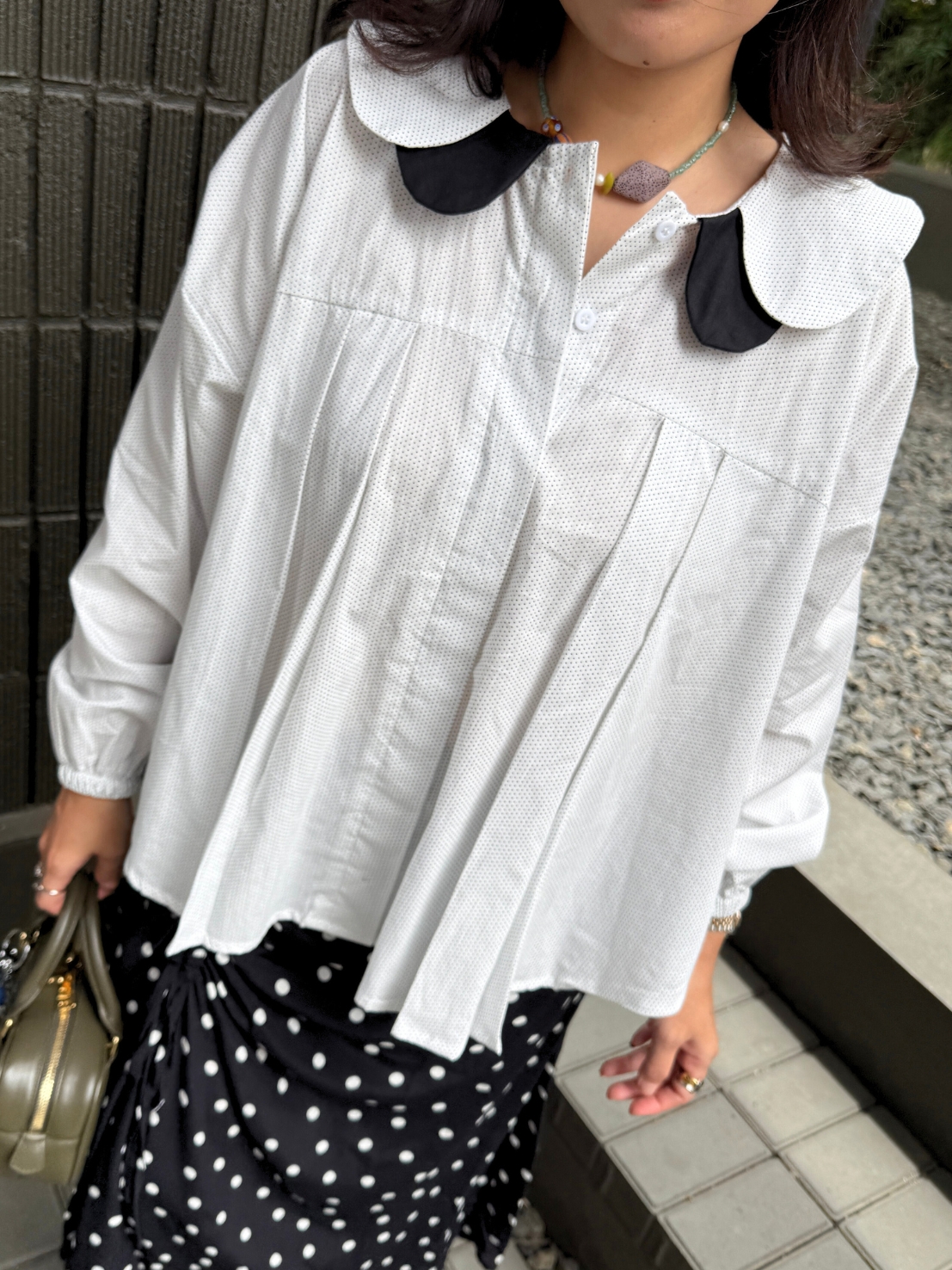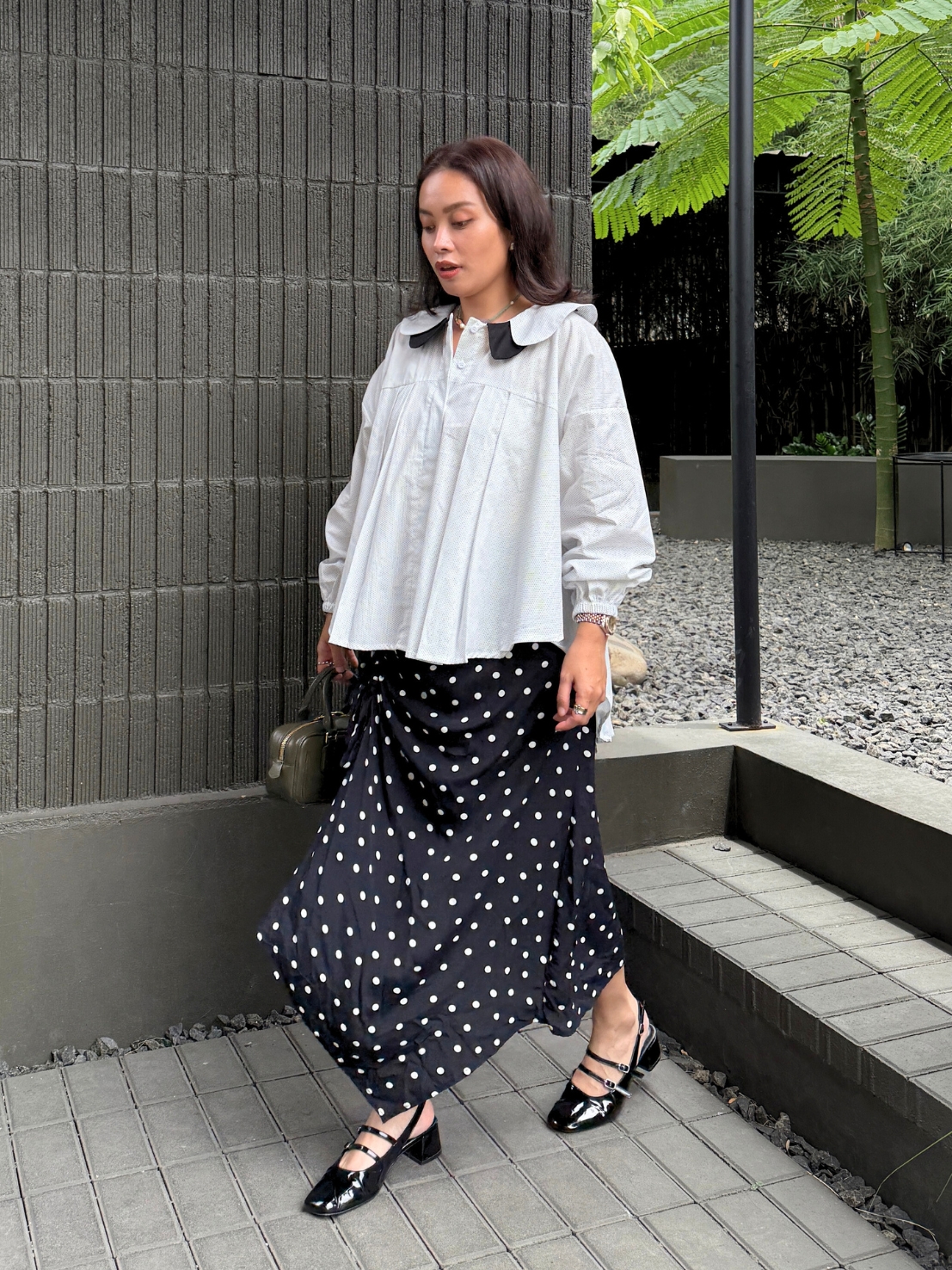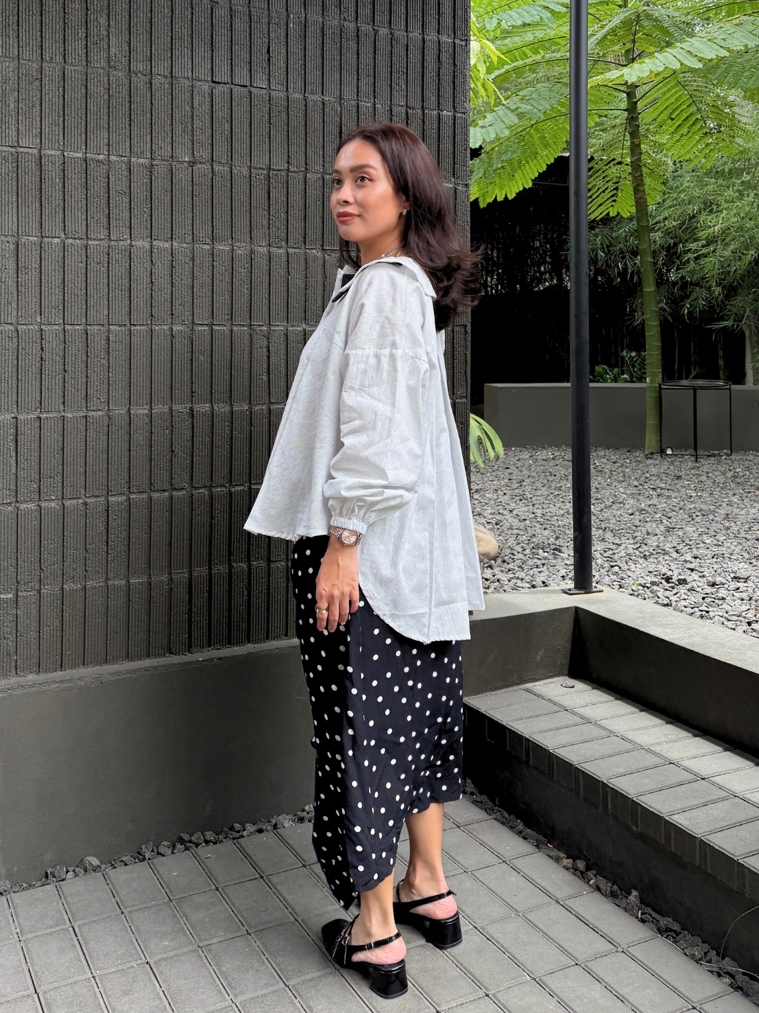 A crisp cotton blouse with tiny polka details and a sharp pointed collar. Relaxed silhouette that works effortlessly for daily errands or casual office looks.