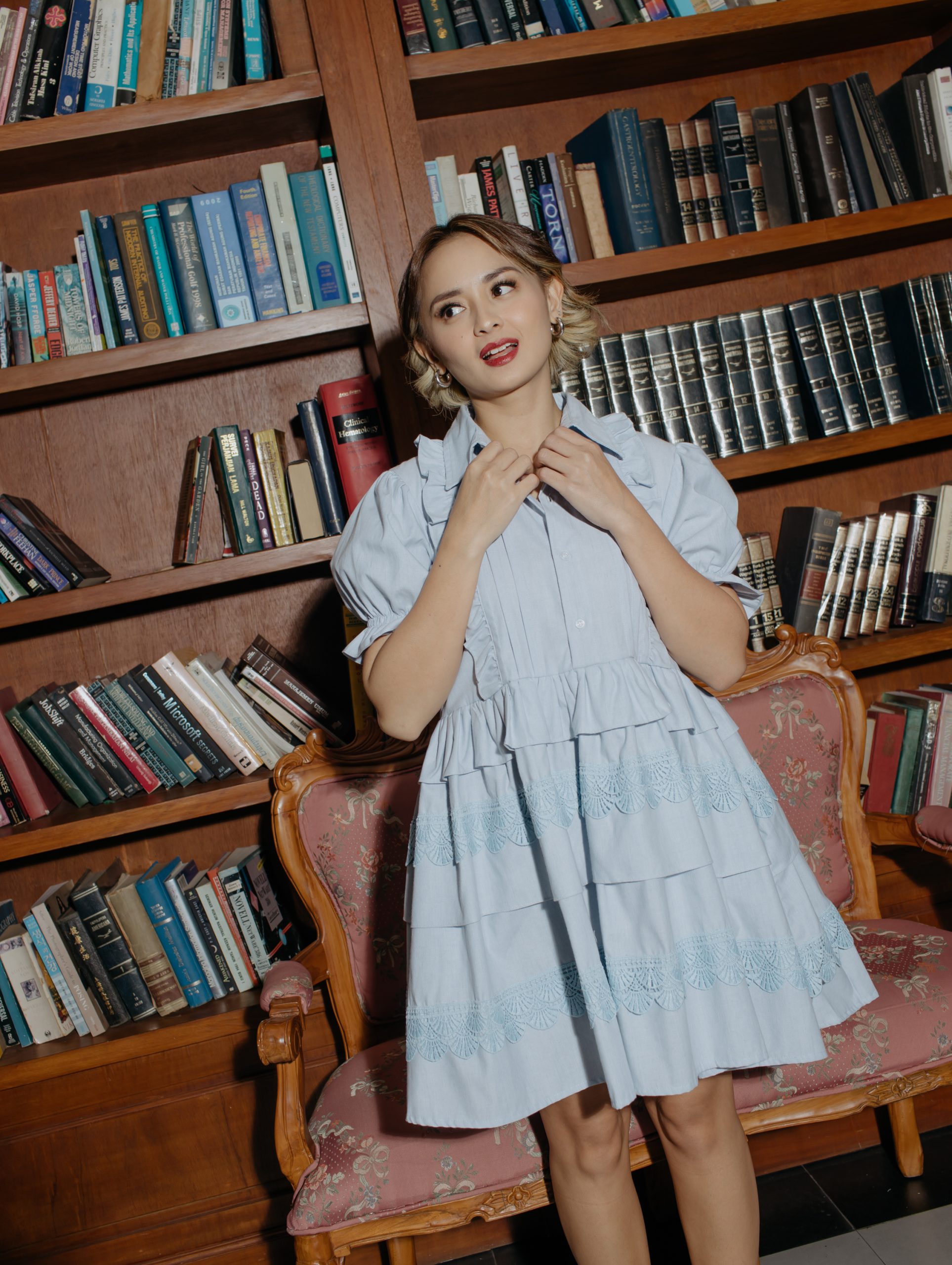 This pretty mini dress in soft blue features stylish pleats, puffy sleeves, and brocade details. Made from ultra-soft, breathable cotton, it’s designed for comfort and style in everyday wear.