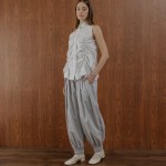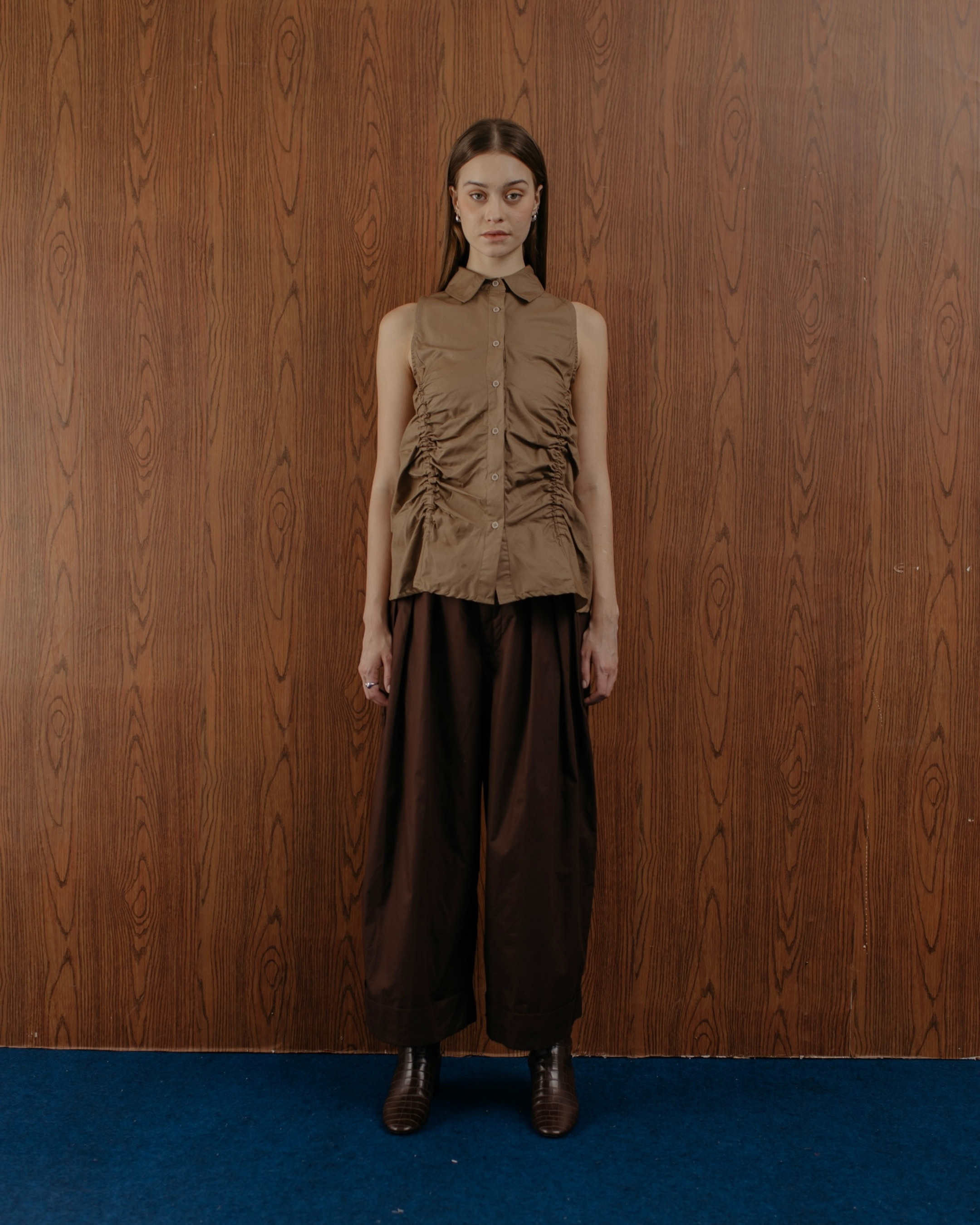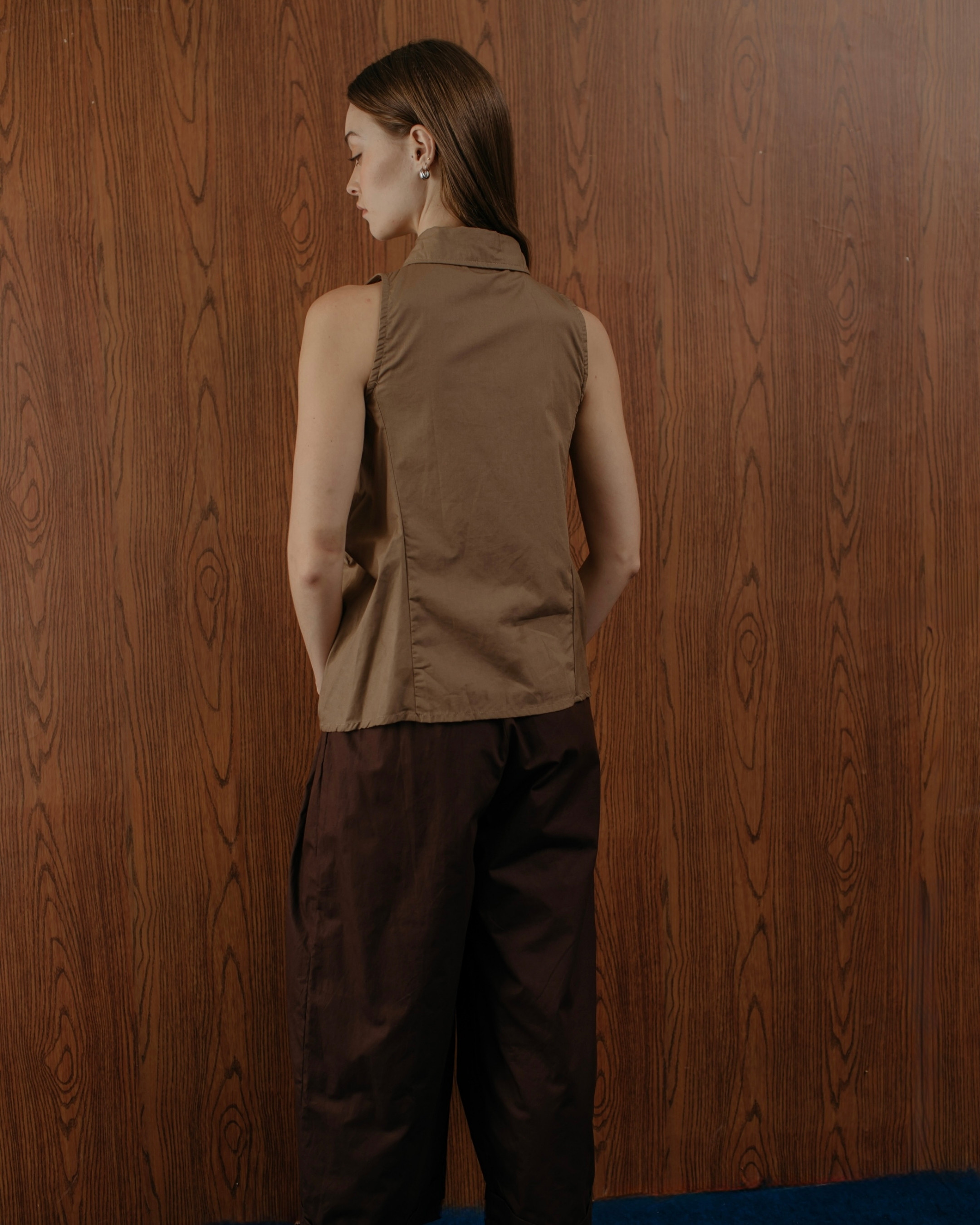A sleeveless brown cotton top with gathered details that create a flattering shape. Easy to style with wide pants or skirts for a smart-casual look.