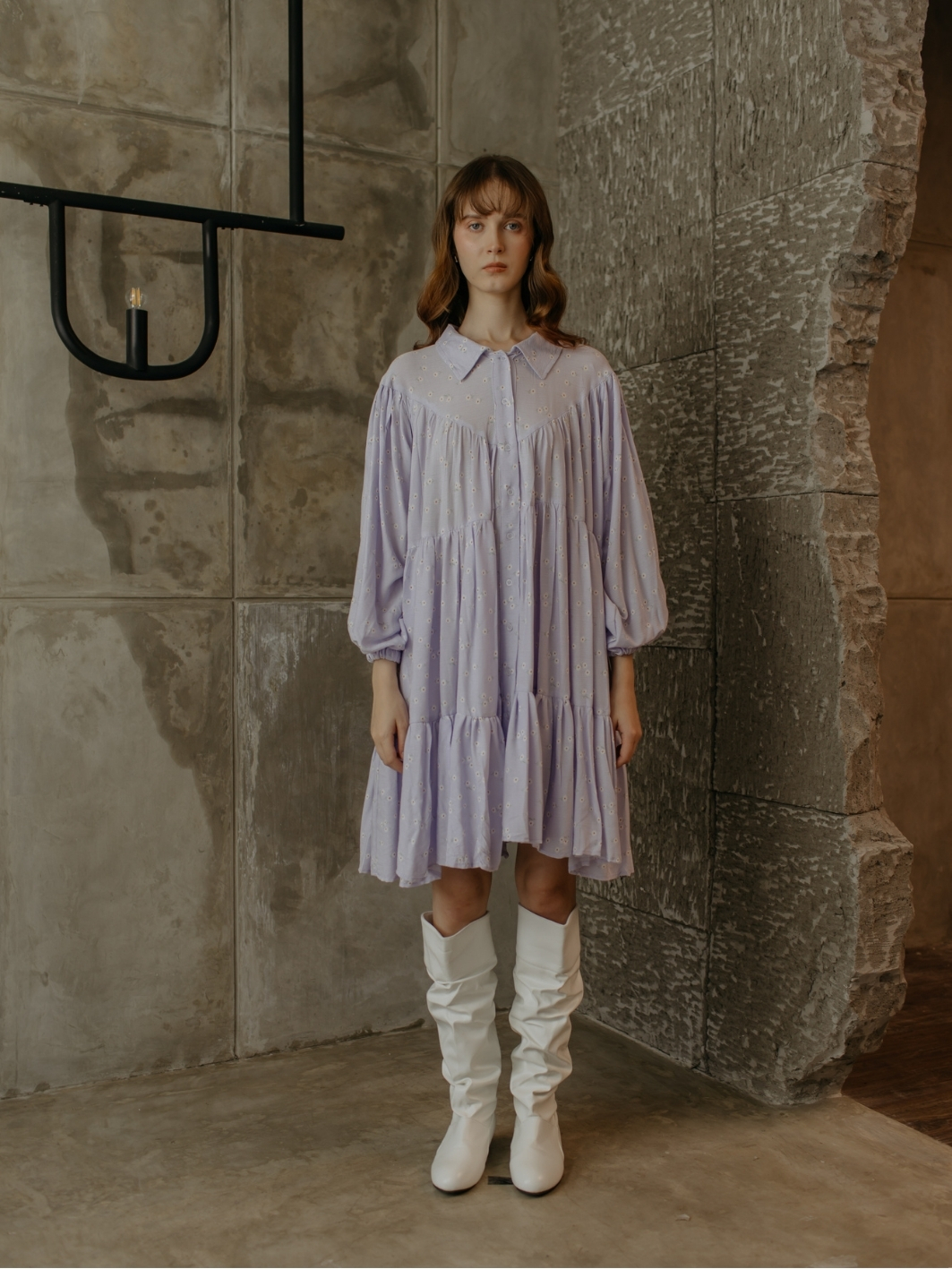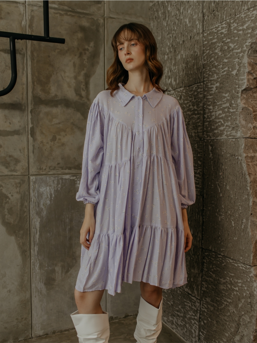 Feminine and flowy in a charming lilac floral pattern. Fits up to XXL while staying flattering for all sizes, with adjustable elastic sleeves and full buttons.