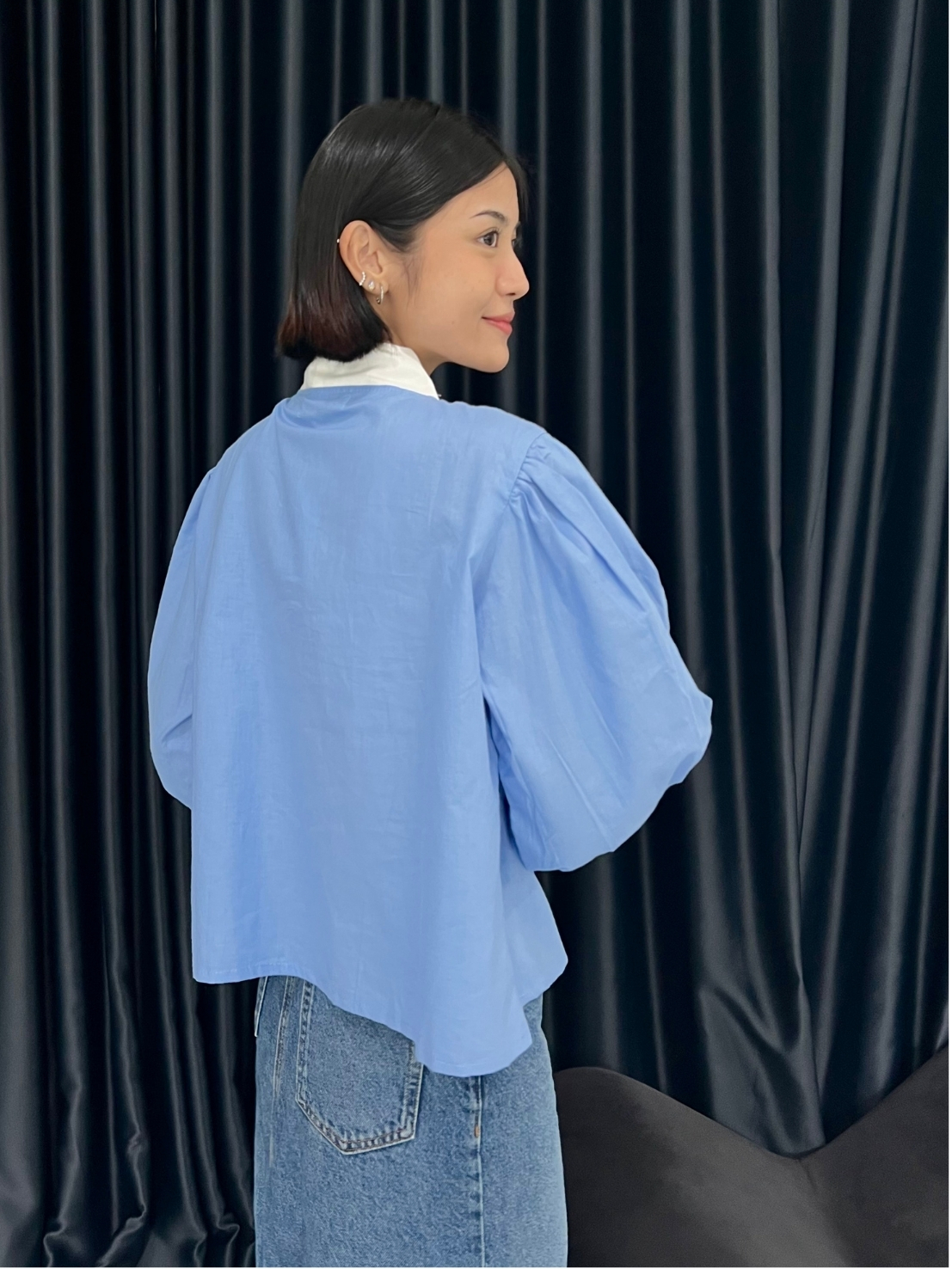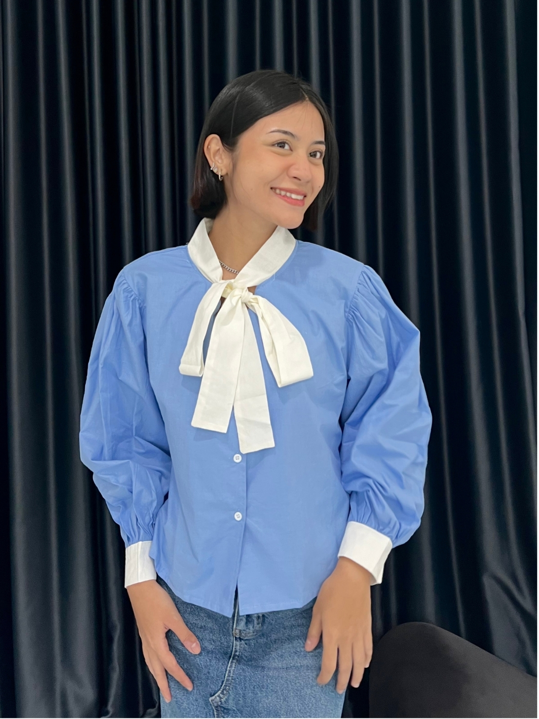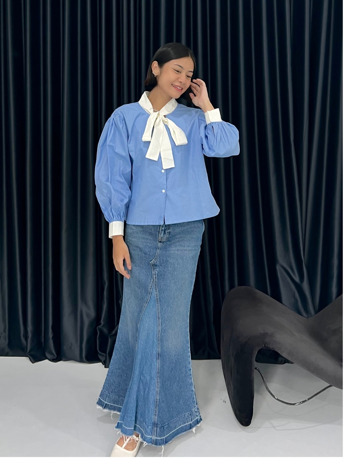 This pretty blue top combines simplicity with a touch of charm. Featuring a front tie detail, full buttons, and made from soft, breathable cotton poplin, it’s perfect for staying cool and stylish every day.