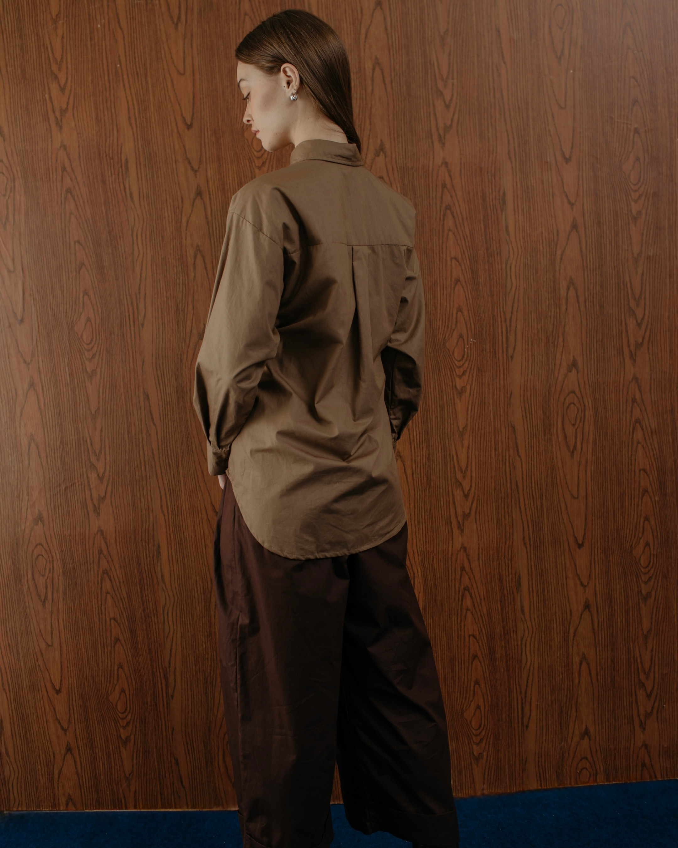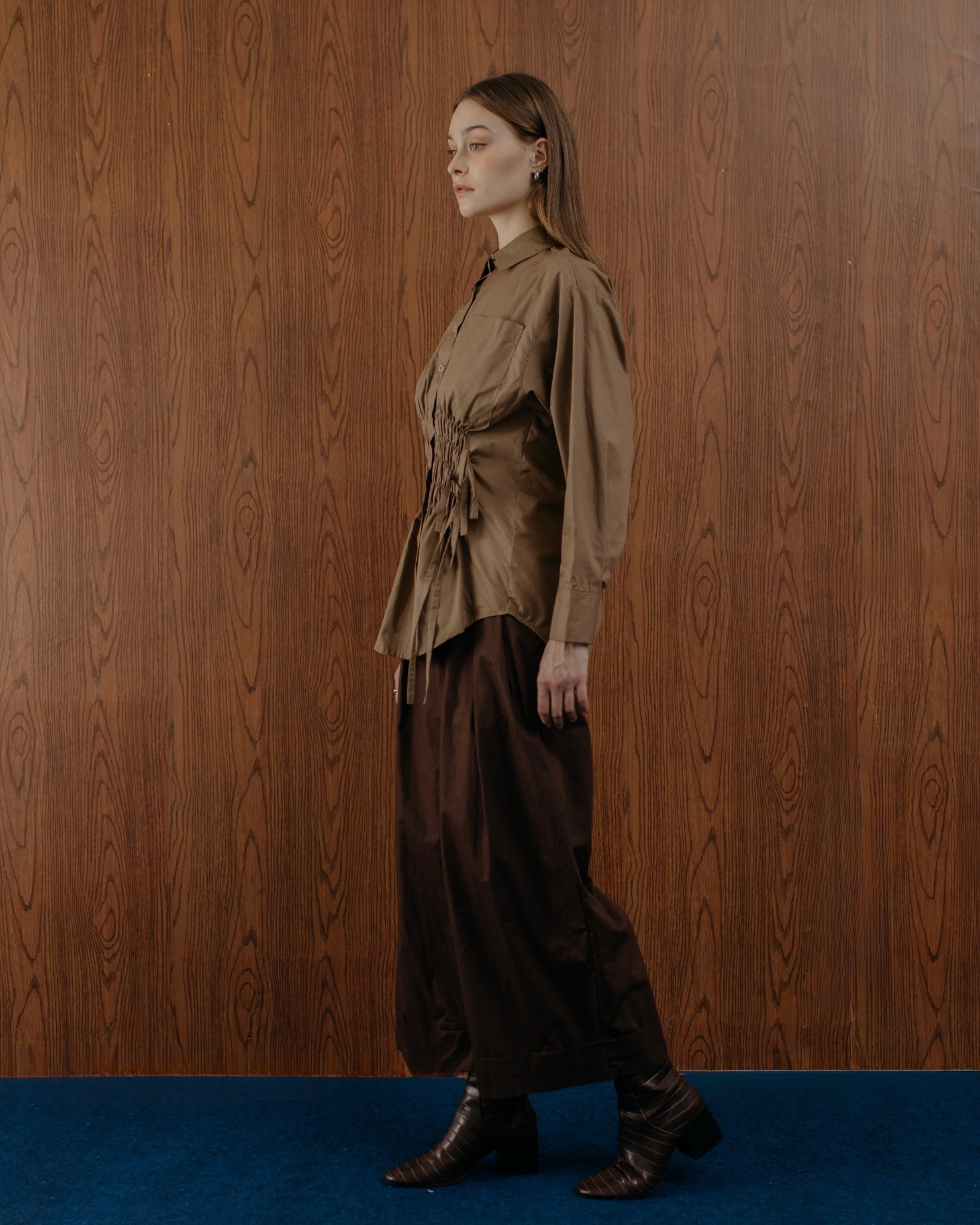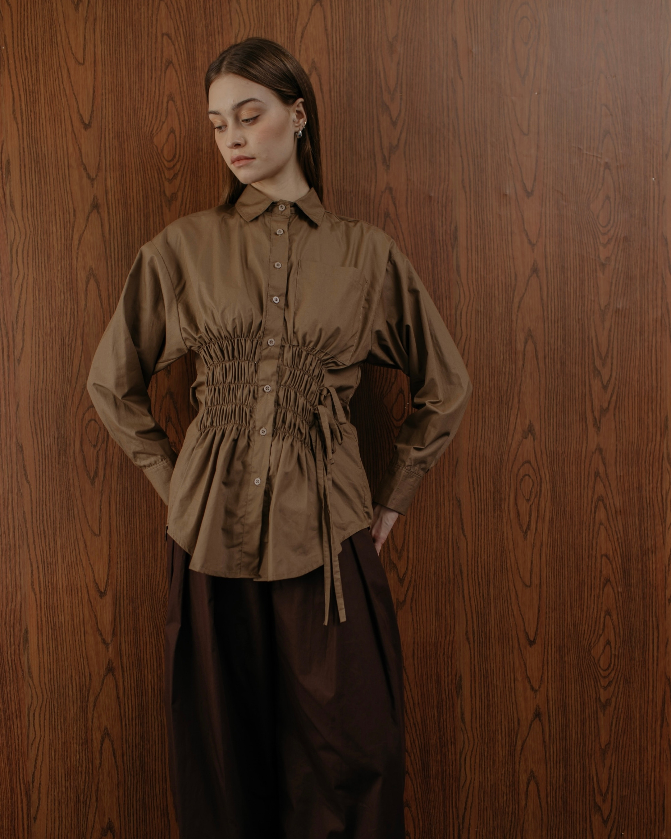Made from cotton, this brown long-sleeve shirt features ruched details for a modern twist. Ideal for office wear or stylish day outings.