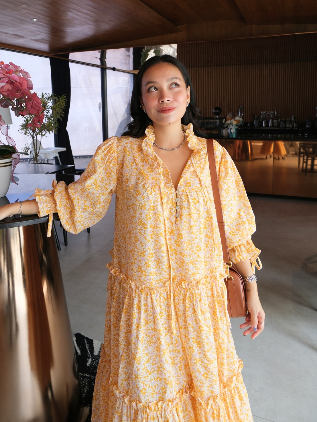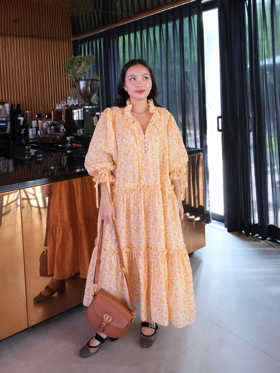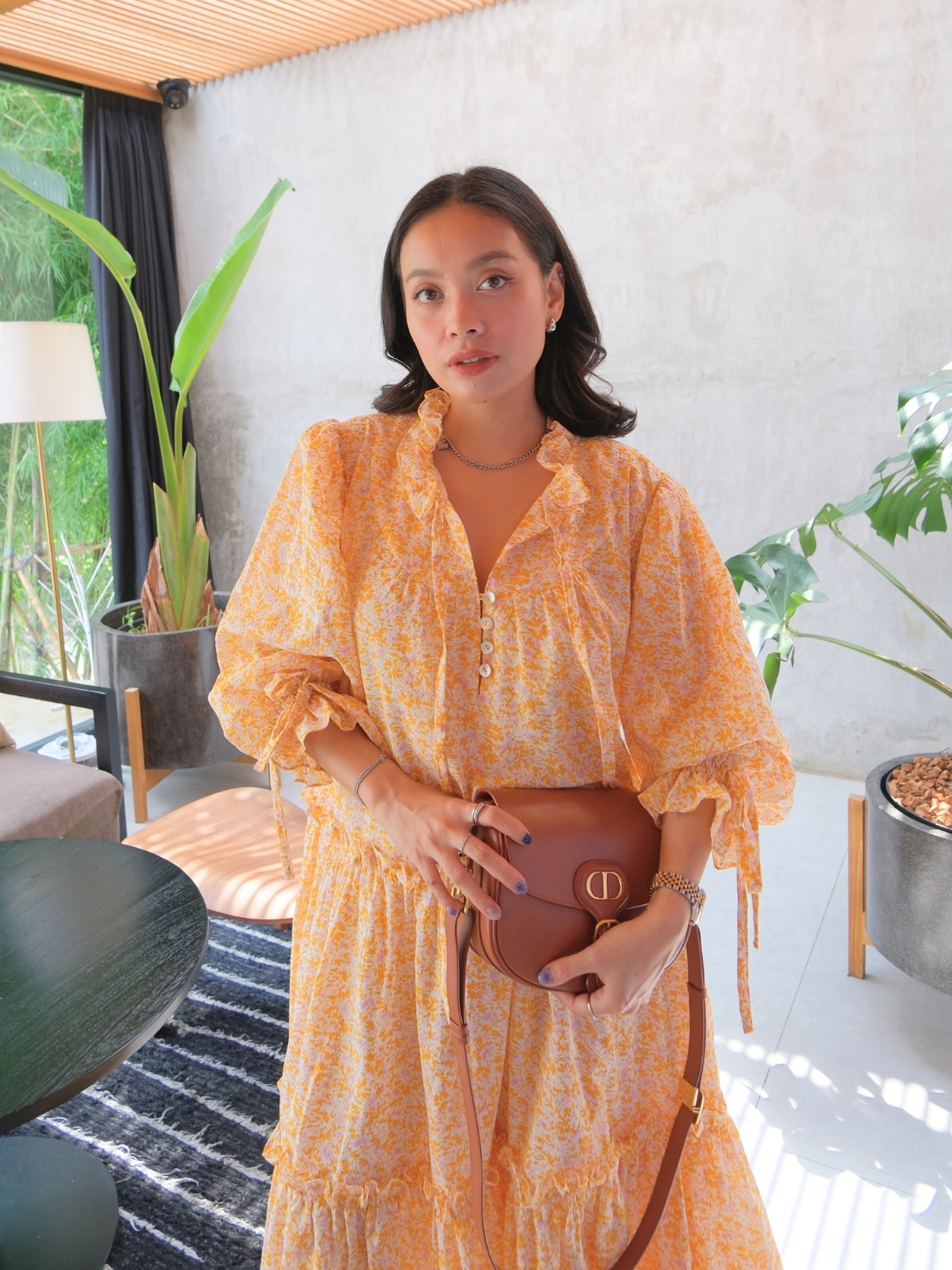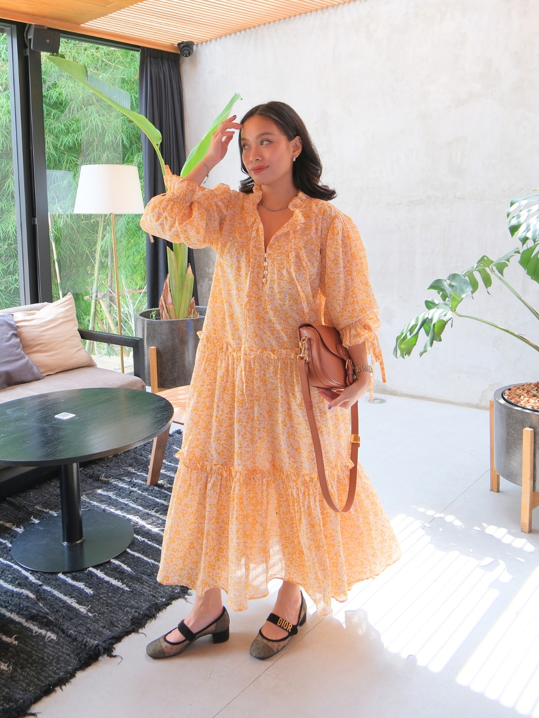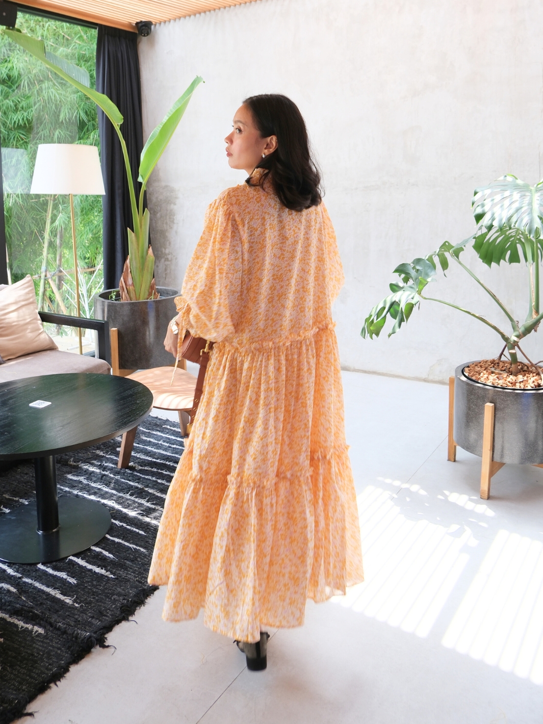 Bright, fresh, and effortlessly pretty. The orange floral pattern brings a cheerful touch, making it perfect for holidays or weekend outings.