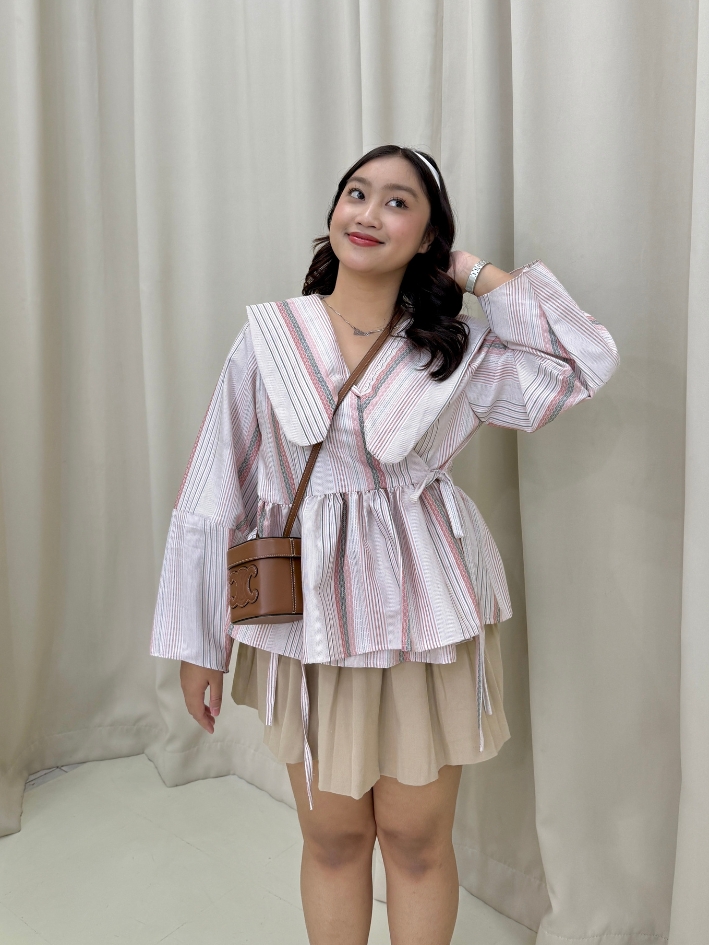 Made from premium cotton, this one features a bold sailor collar, soft flared sleeves, and an adjustable waist tie for that perfect fit. The pink and white stripes give a playful yet polished lookâperfect for a cute day out or casual office wear.