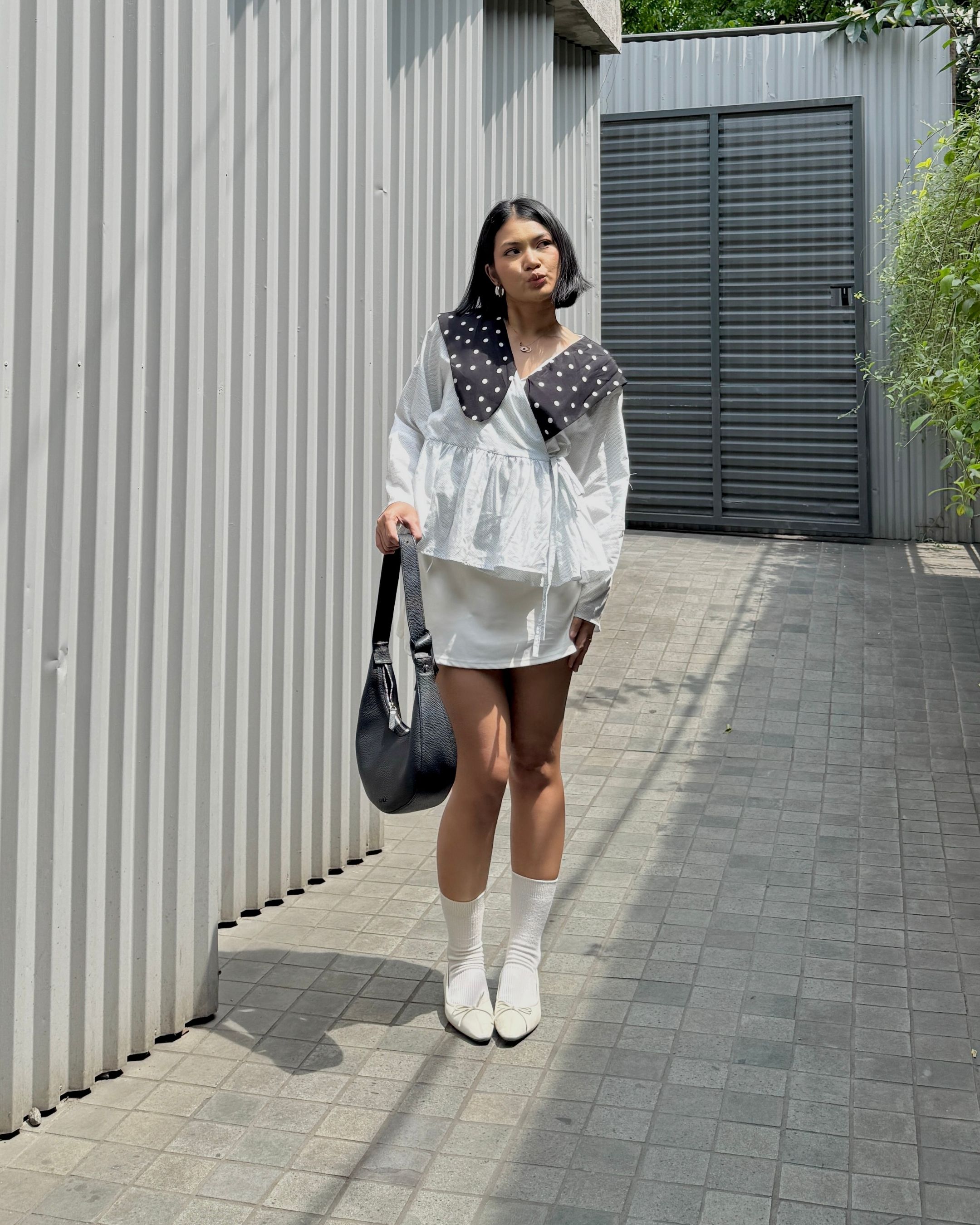 Cotton peplum top with polka dot oversized collar and subtle polka dot base pattern. Playful yet timeless design that elevates any outfit.