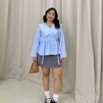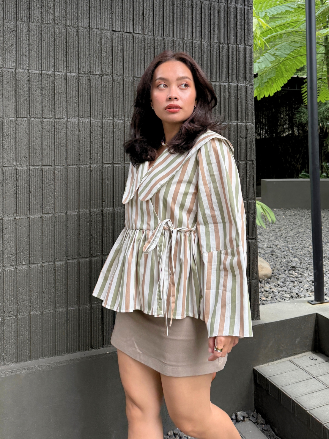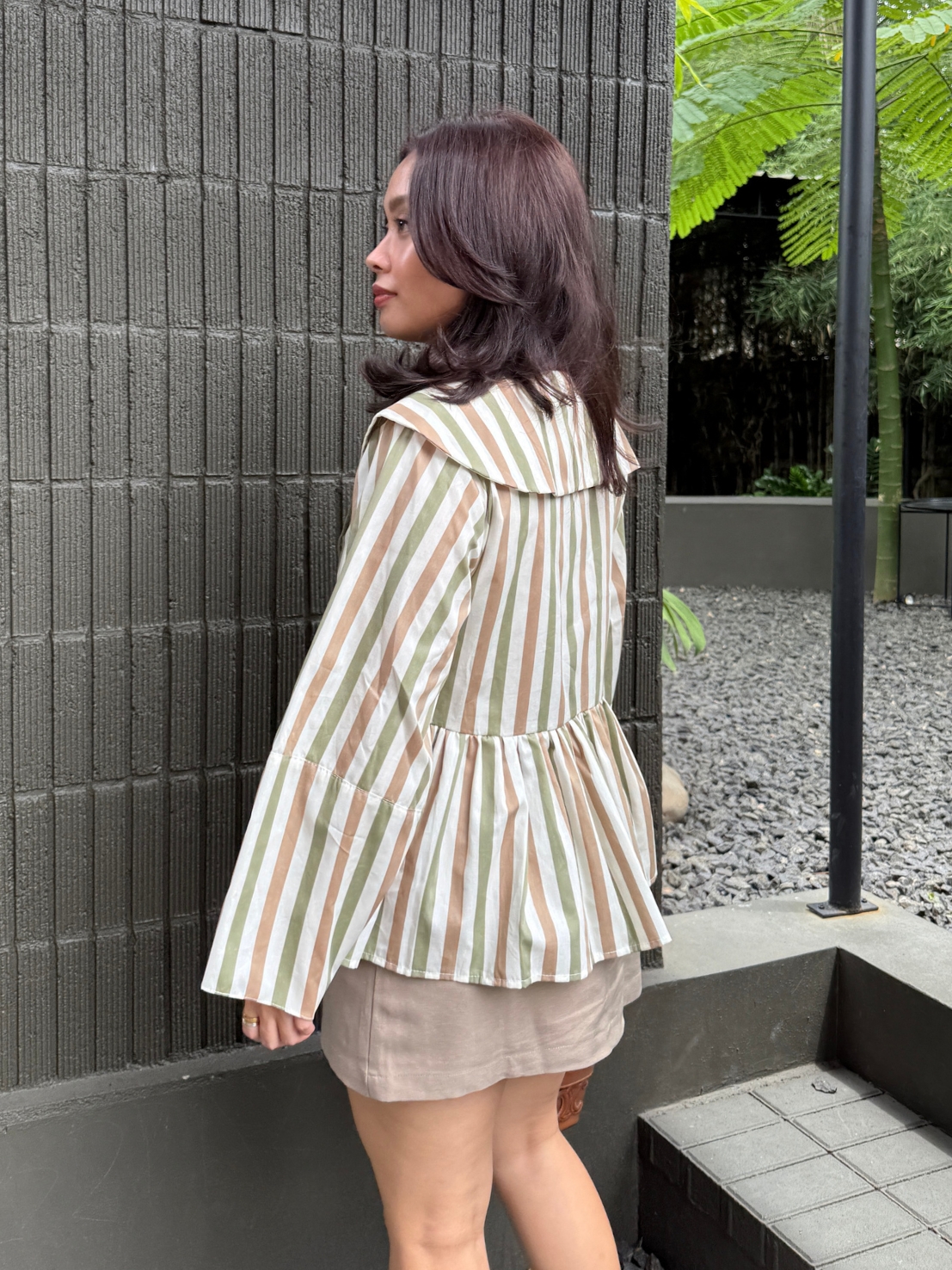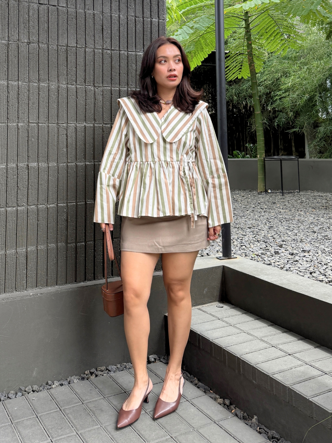 Playful mix-color stripe blouse with peplum cut and wide collar. Creates a cinched waist effect while staying comfy — perfect for casual Fridays or weekend outings.