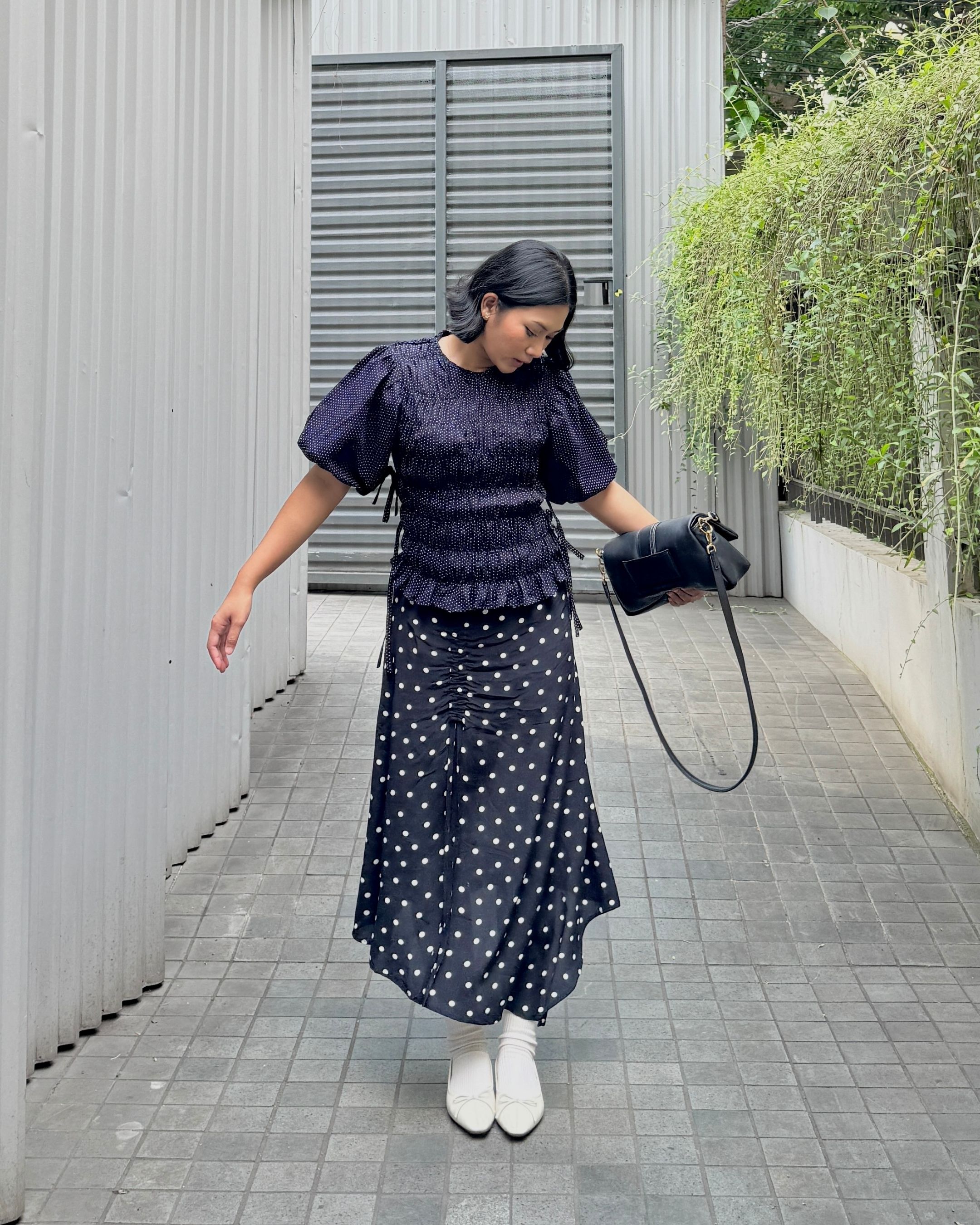Smocked cotton polka dot top with puff sleeves. Feminine yet comfy, designed to fit and flatter effortlessly.