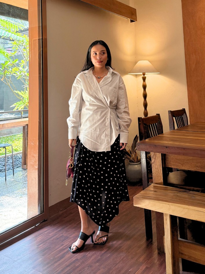 Classic cotton shirt with polka dots, featuring a unique front twist detail. Soft, airy, and stylish for an elevated everyday outfit.
