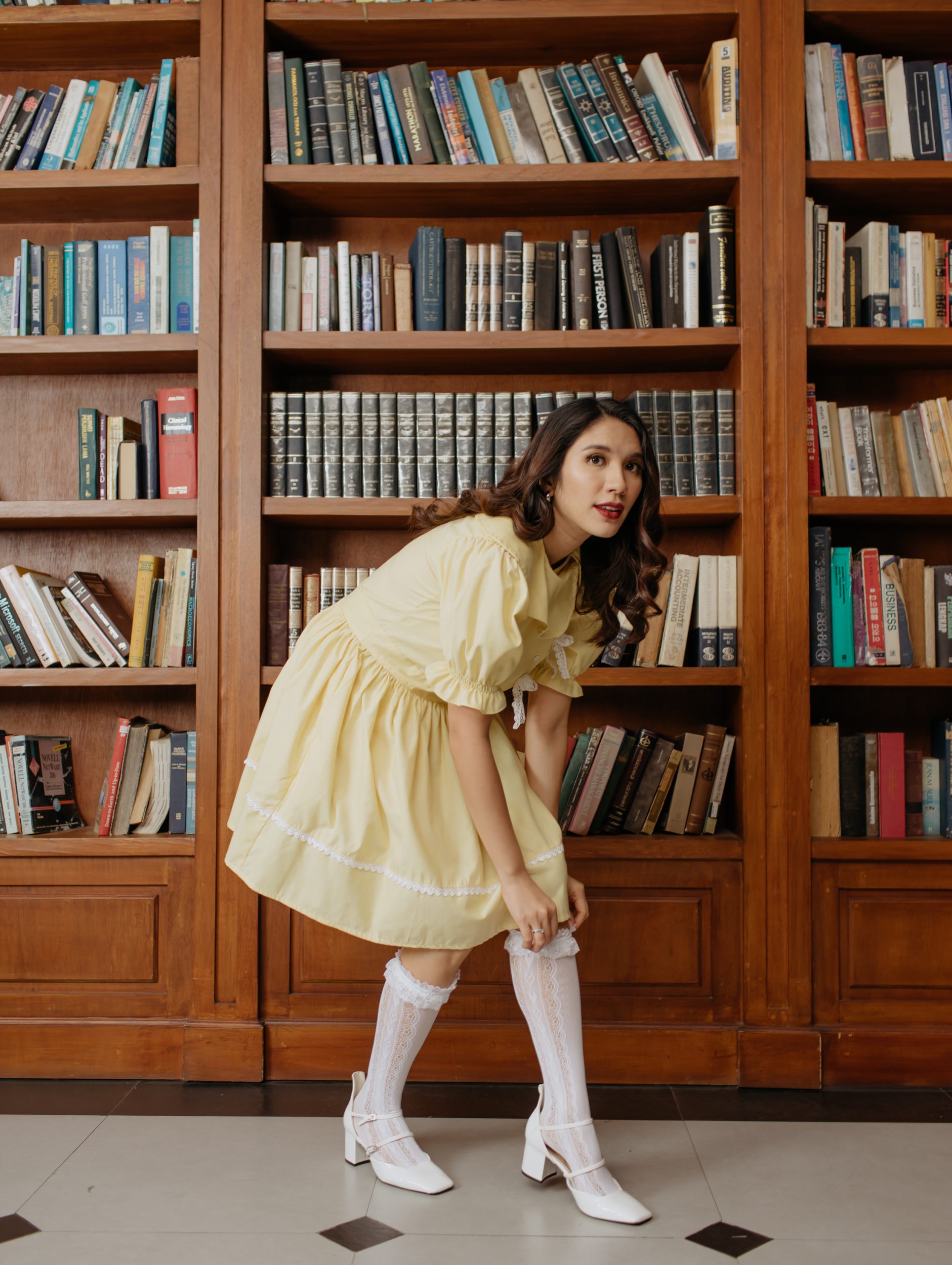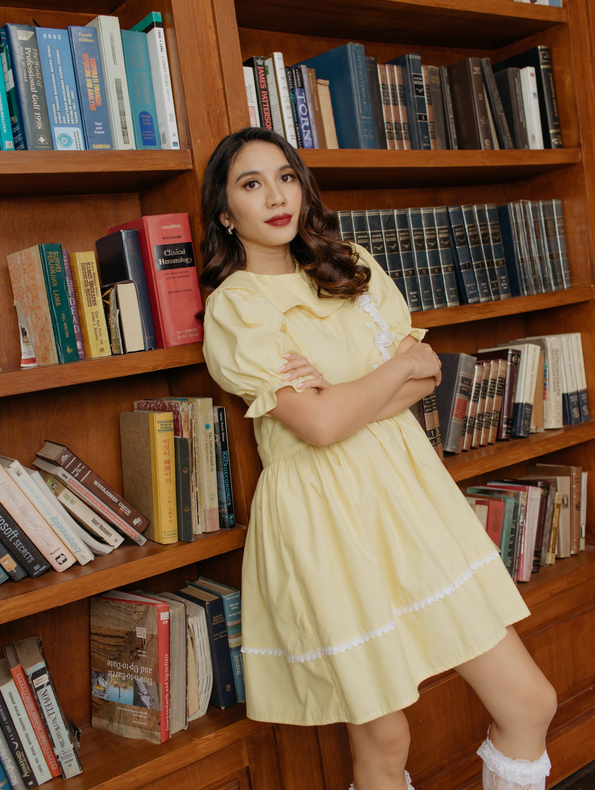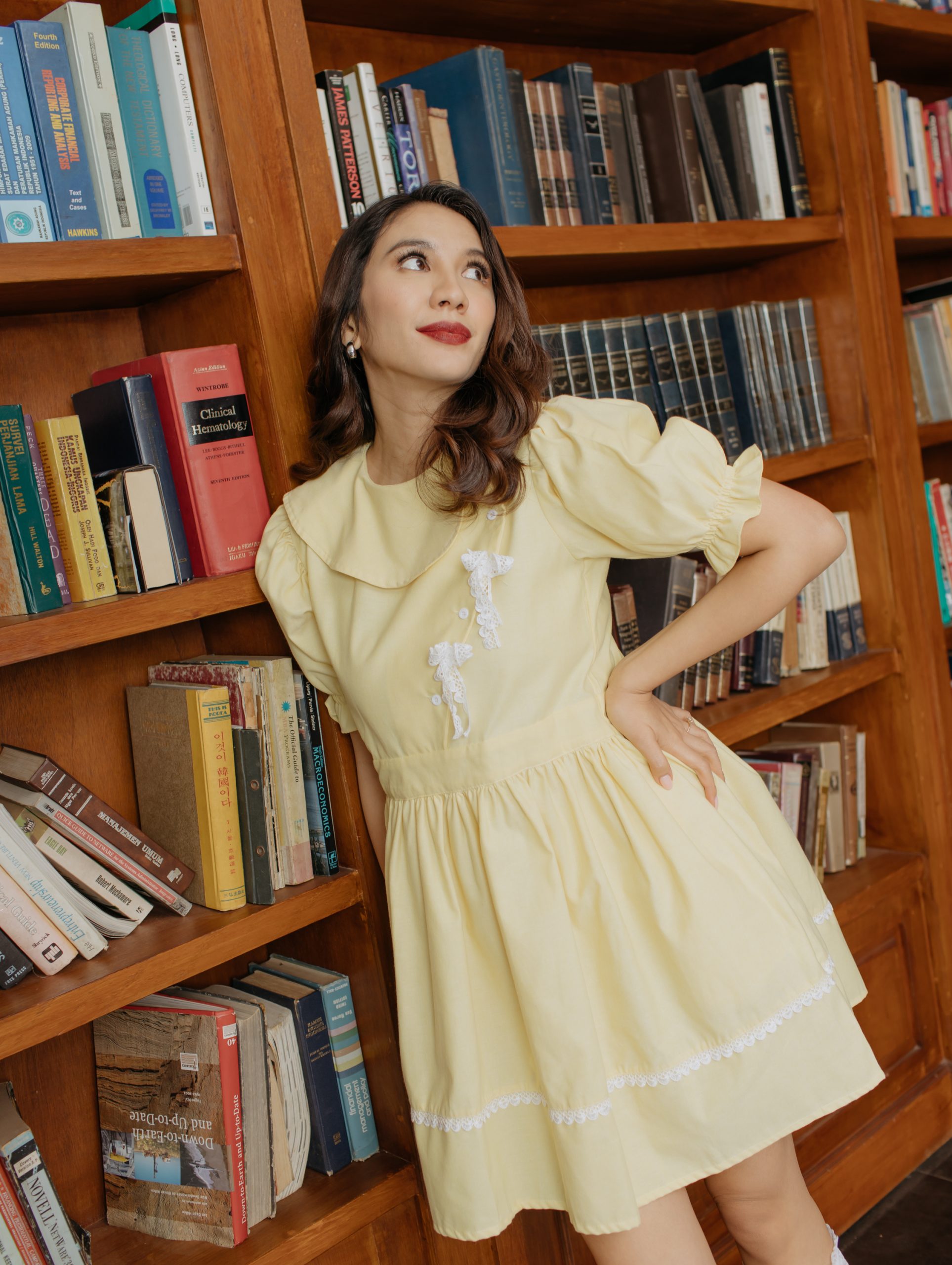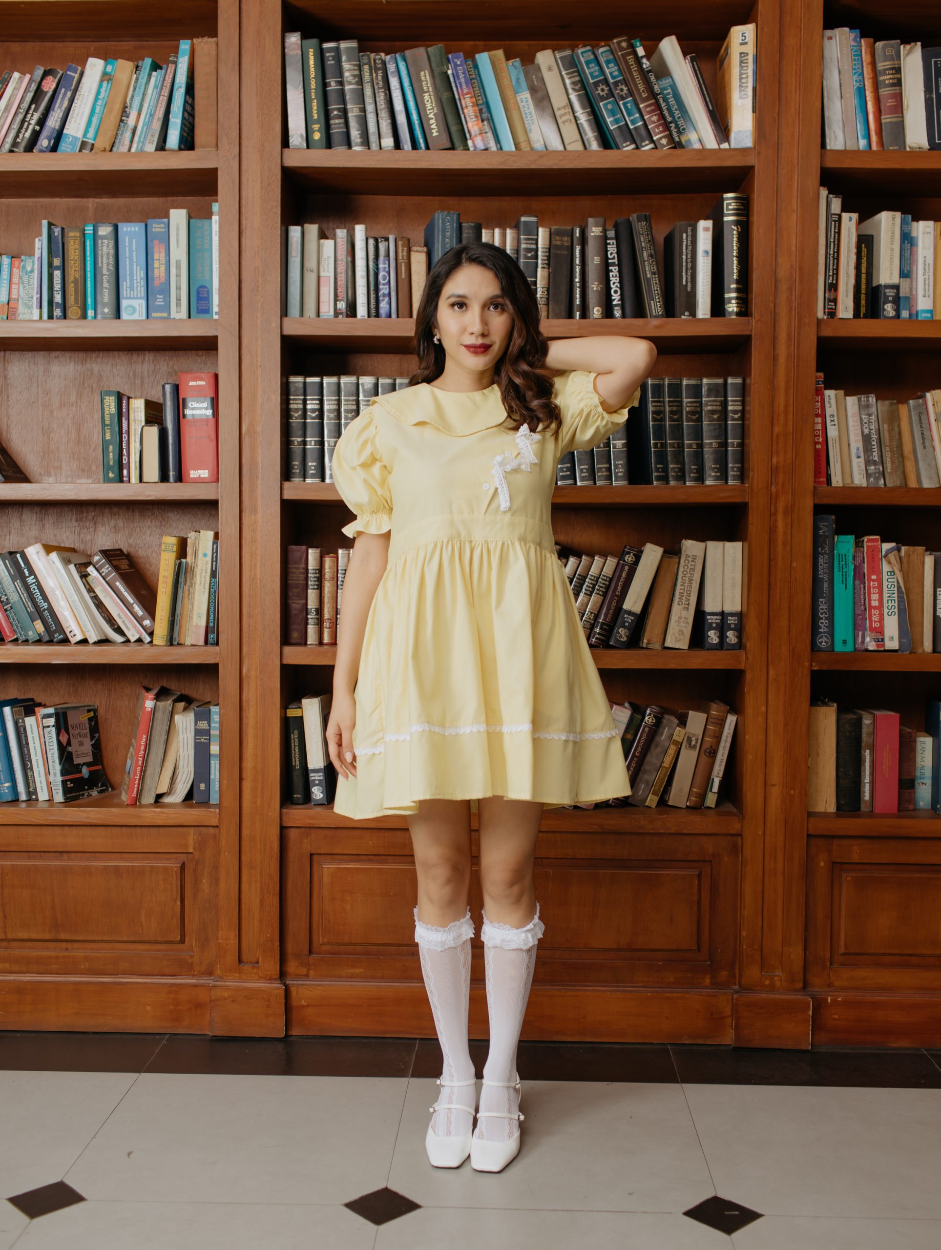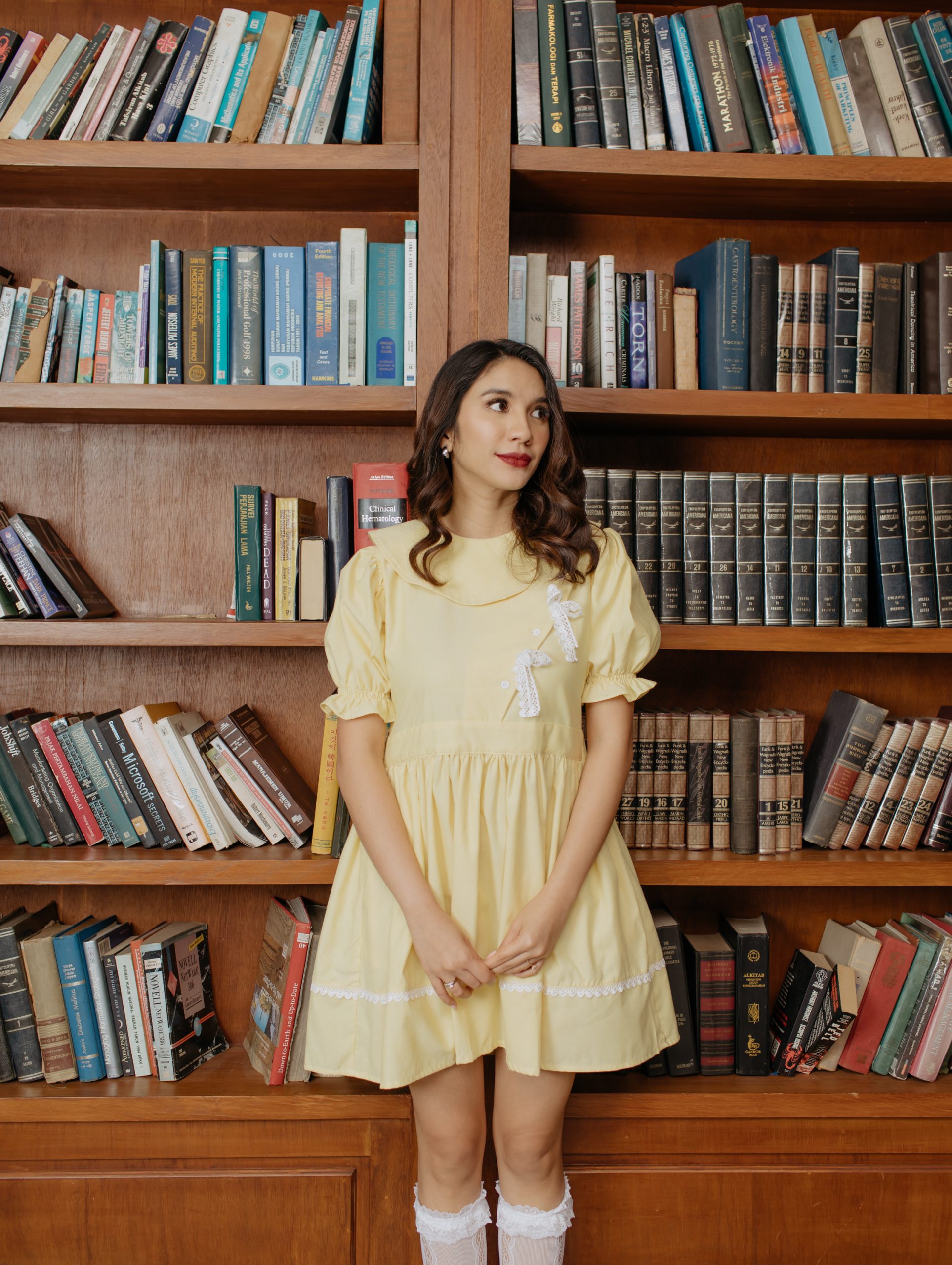 This yellow dress with a brocade bow detail combines style and comfort. Made from breathable cotton, it’s designed for a chic, relaxed holiday style.