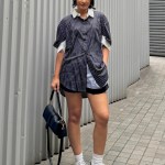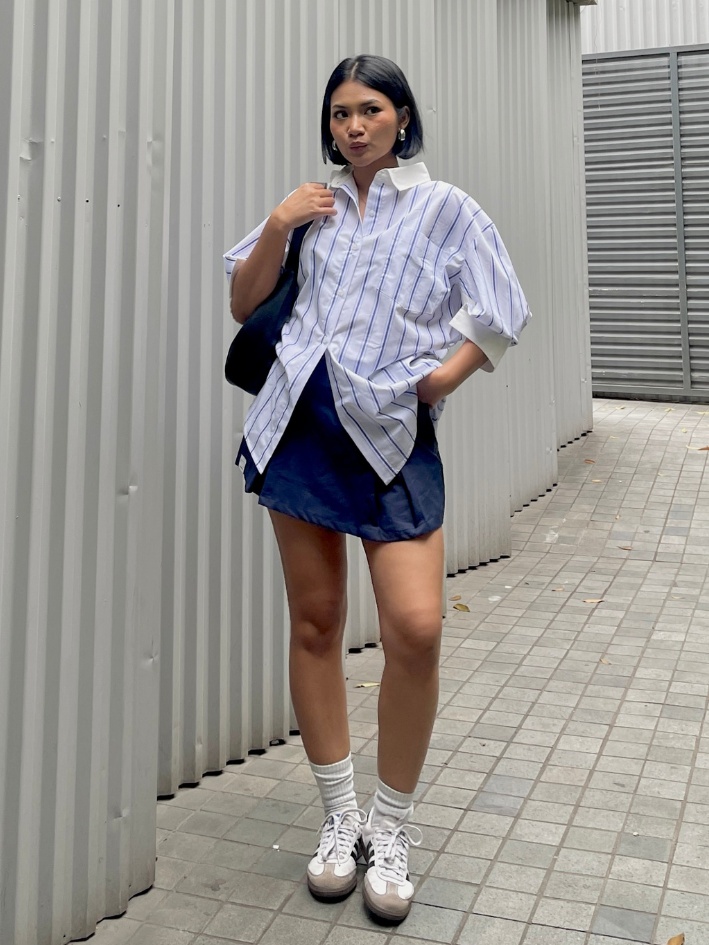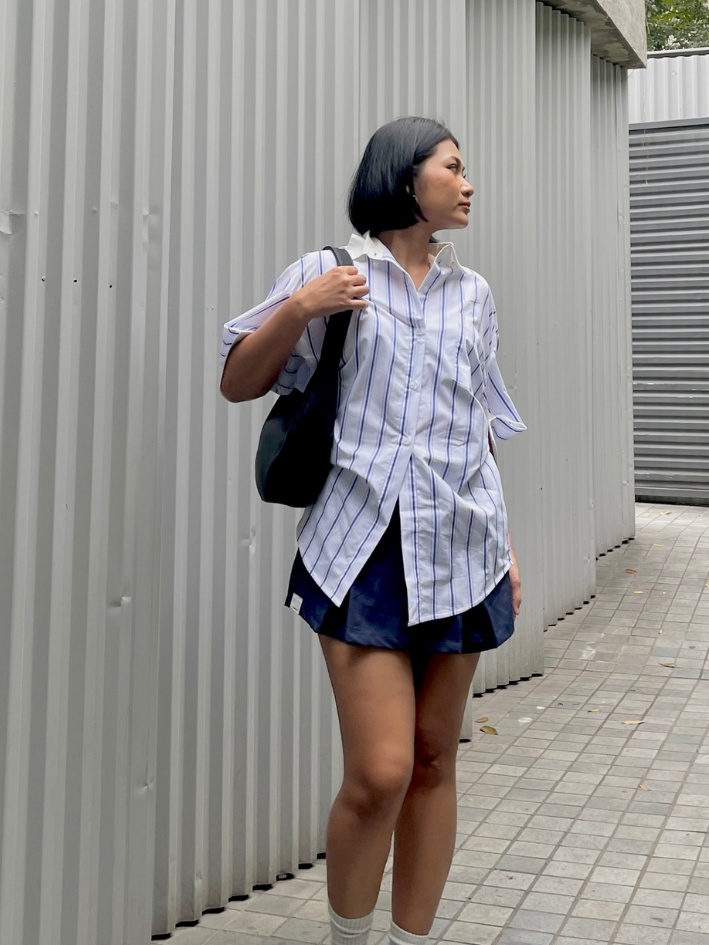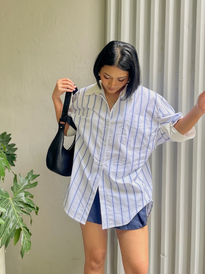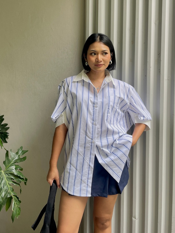 Relaxed cotton shirt with vertical stripes. Features a side button detail that allows you to wear it in two different styles. Timeless and versatile for daily wear.