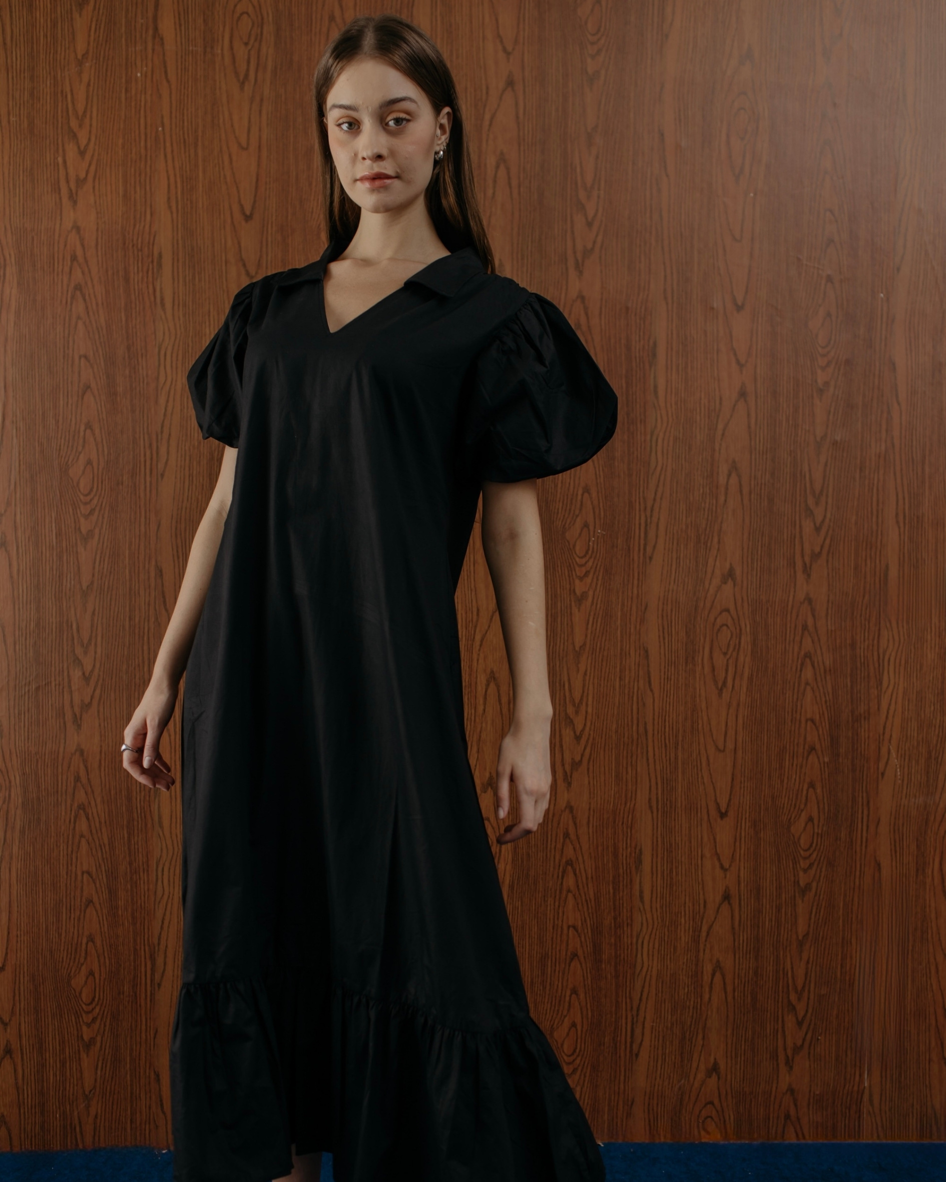 Long cotton dress with subtle ruffle trim and flattering V neckline. Timeless, easy to wear, and perfect for both day and night.