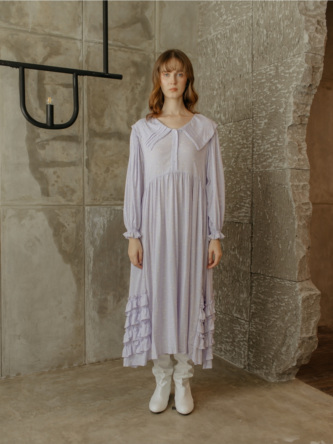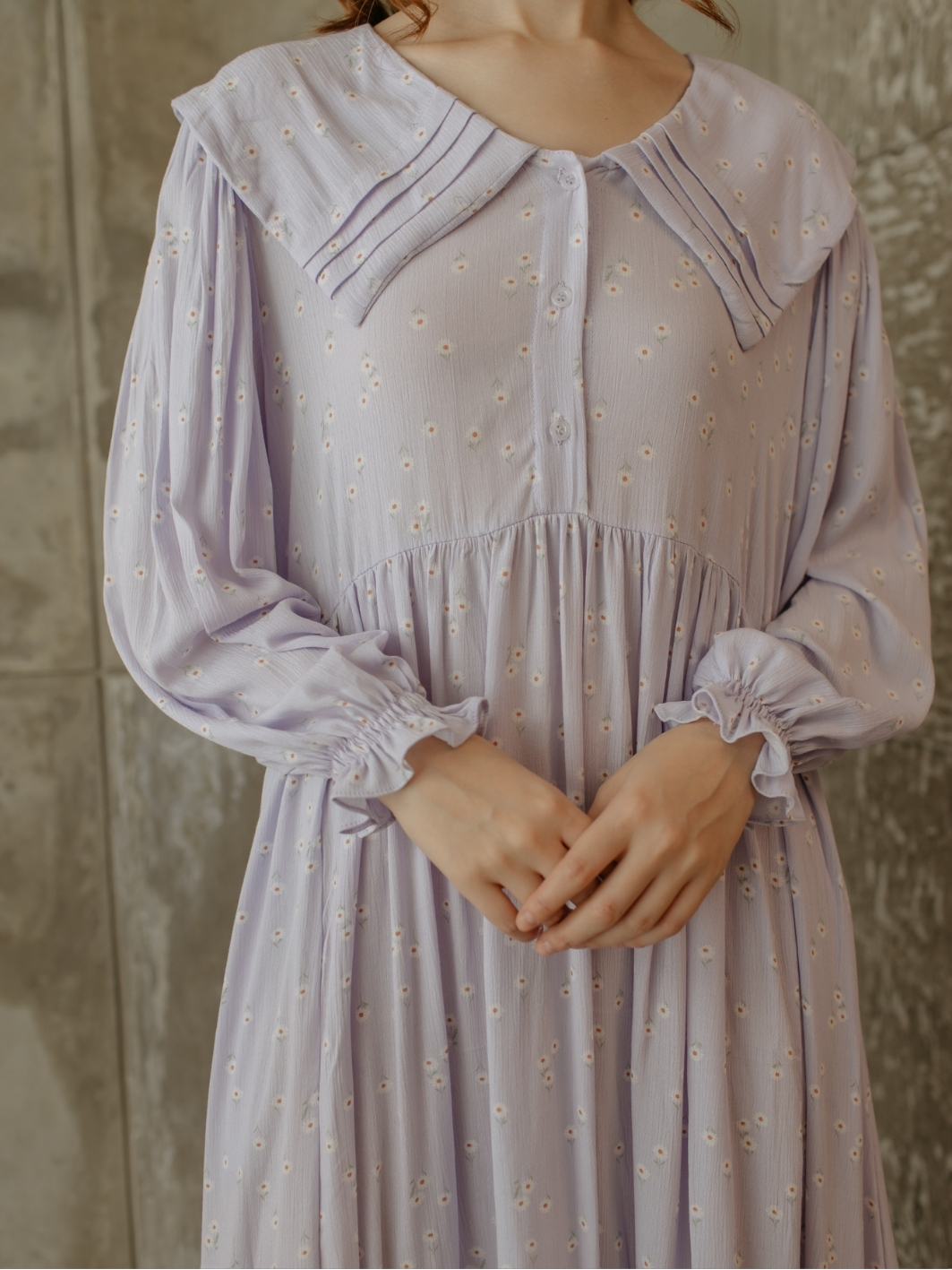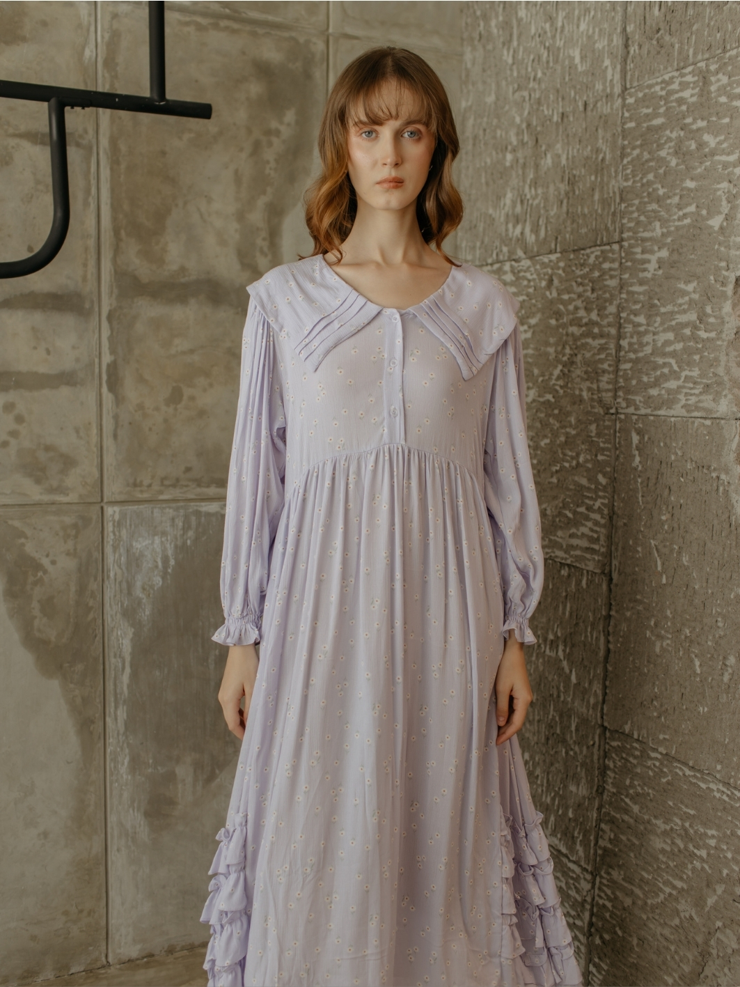 Effortlessly graceful in a dreamy lilac floral print. Designed with a unique neckline, flowy silhouette, puffy long sleeves, and ruffle accents for a soft, romantic look.