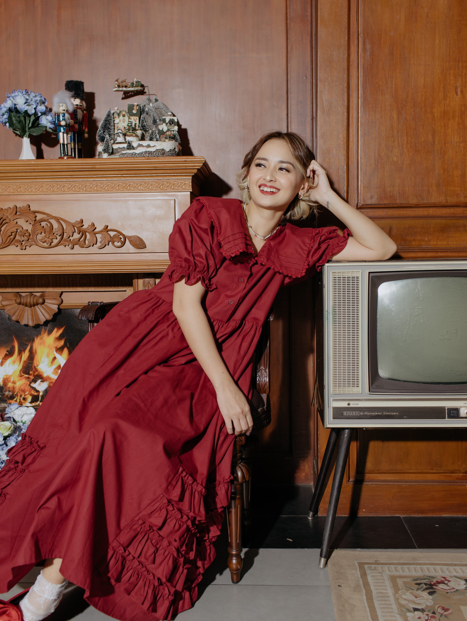 Make a bold statement in this red long dress, featuring puffy sleeves and delightful ruffles at the hem. Crafted from breathable cotton cigarette for a perfect blend of style and comfort.