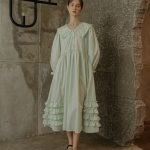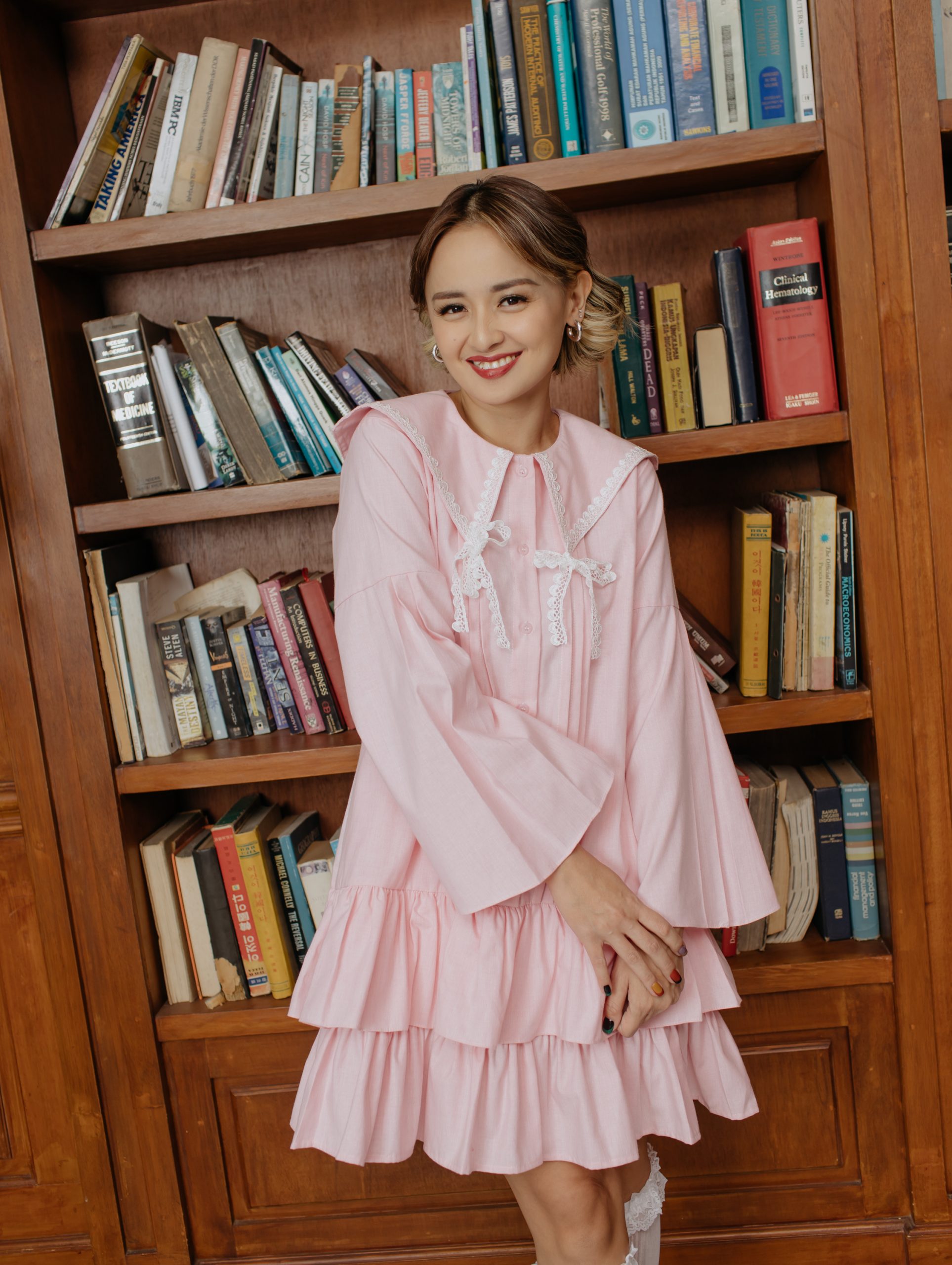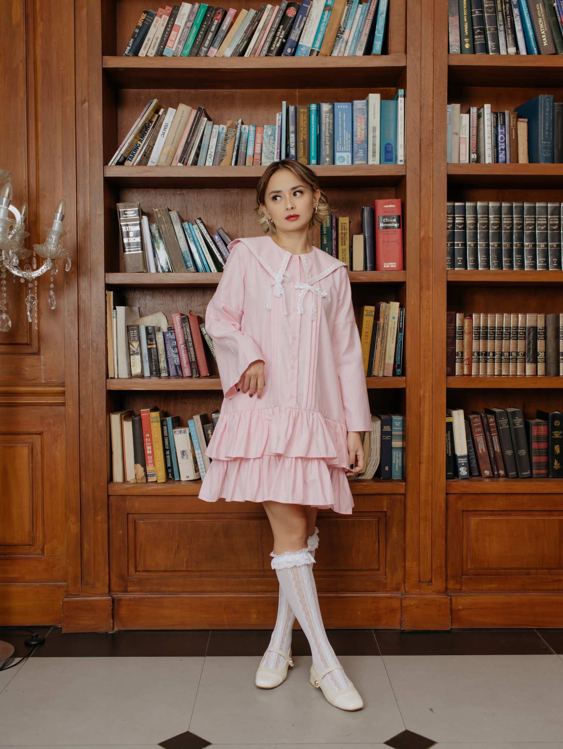 A stunning pink dress with a brocade detail on the collar. Crafted from soft, sweat-wicking cotton, it offers both style and comfort for daily wear.